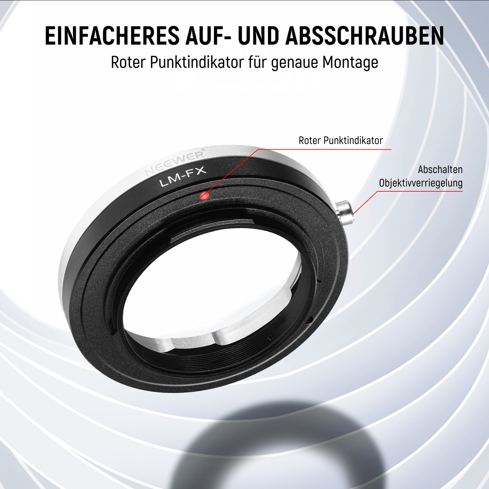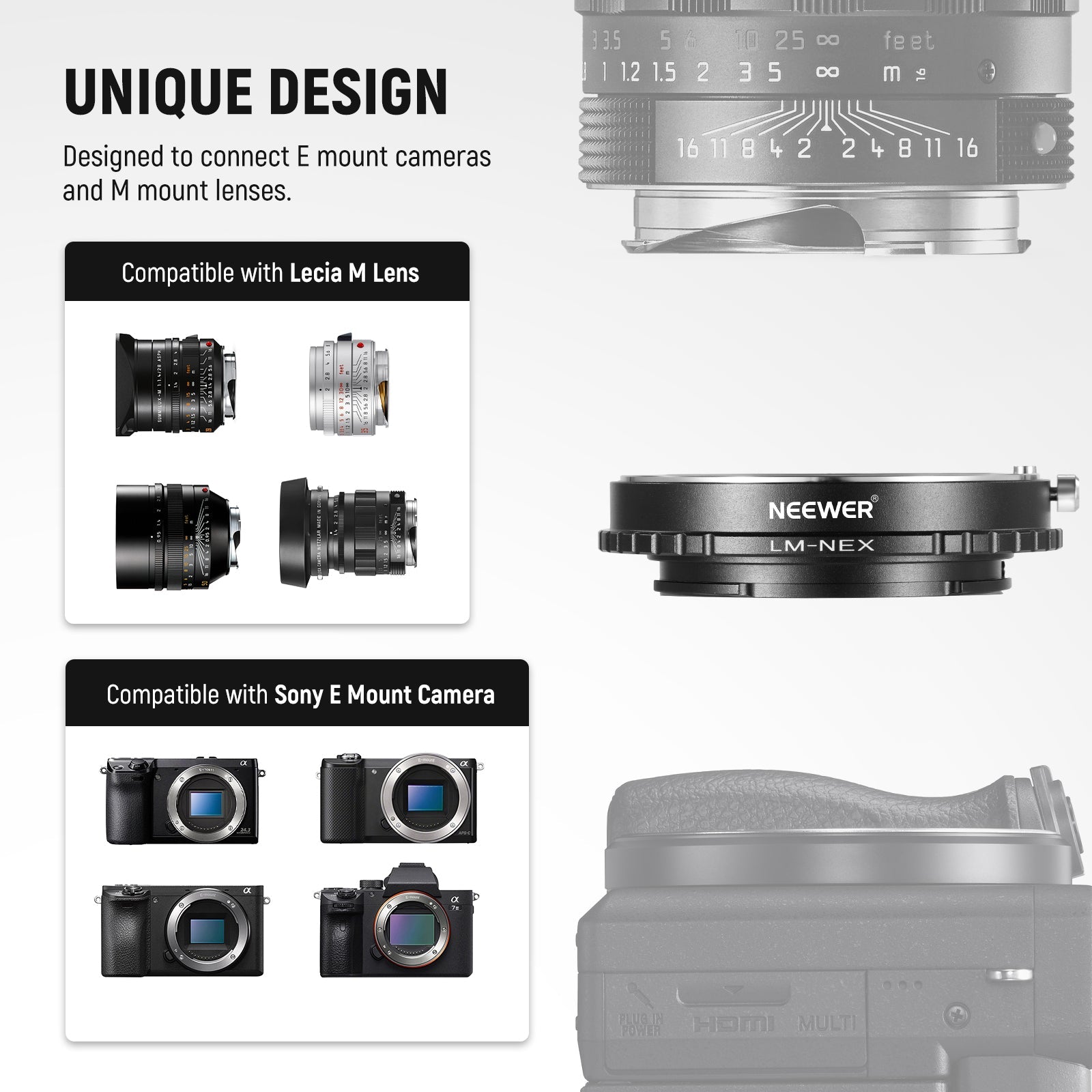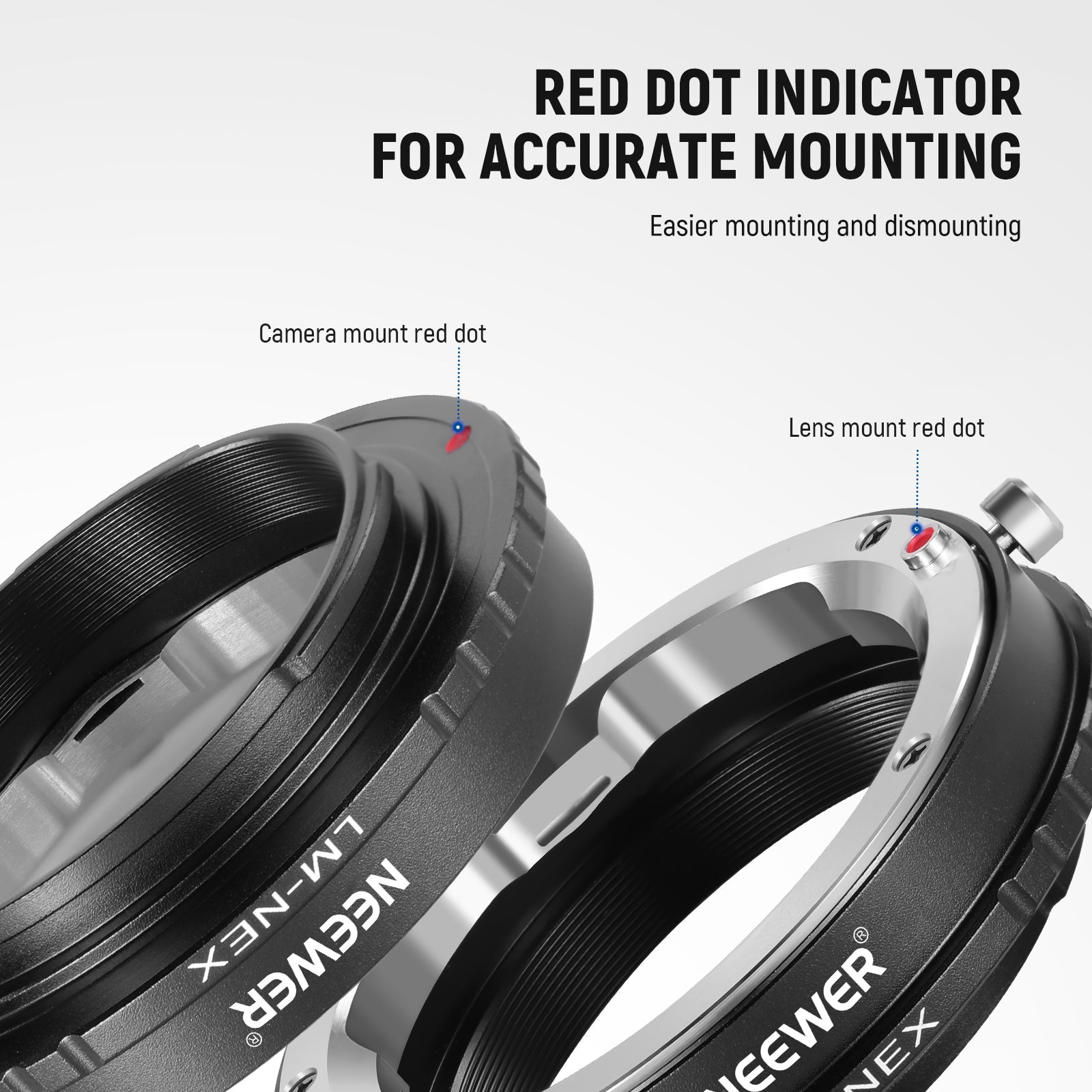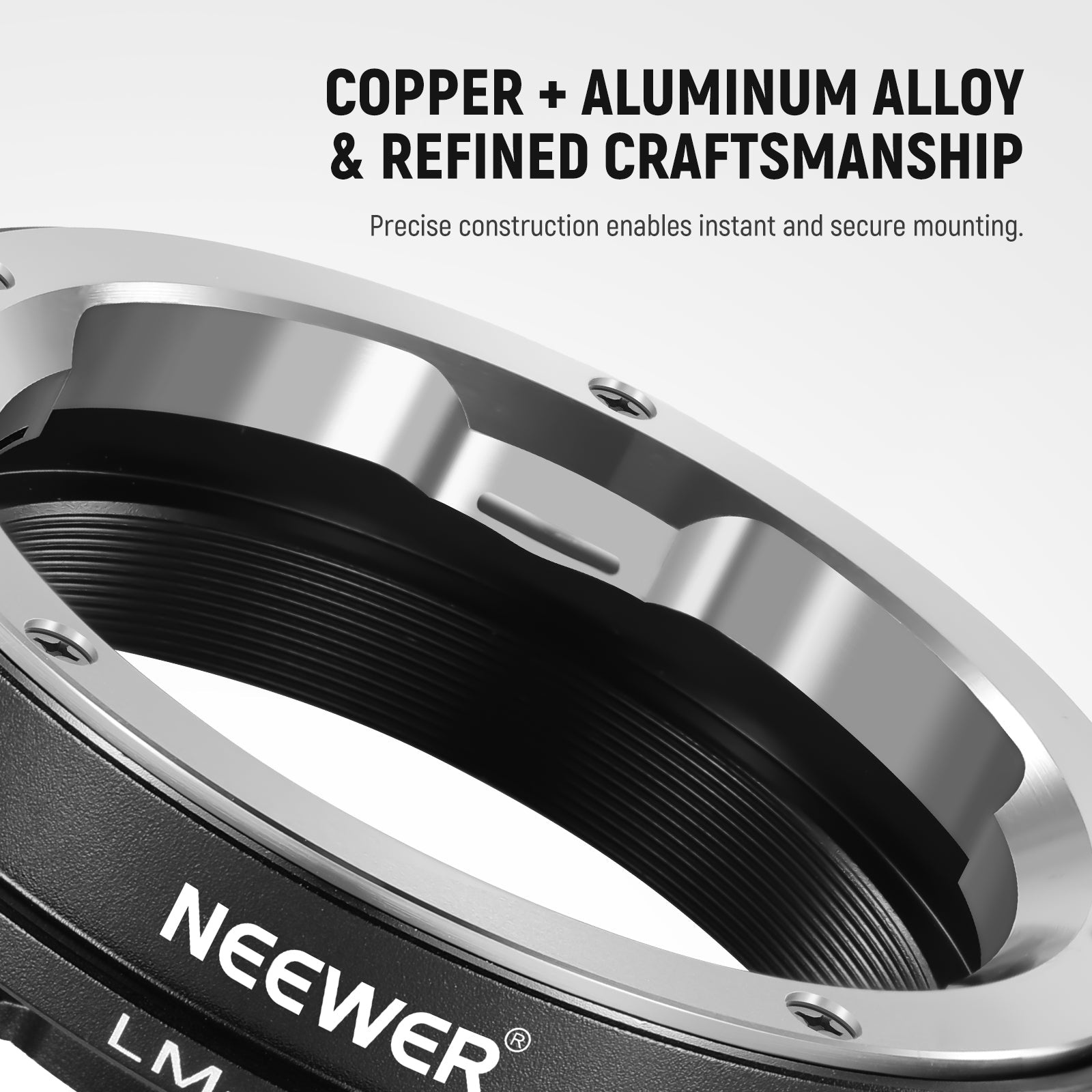 NEEWER bietet eine breite Auswahl an Objektivadaptern. Egal, ob Sie einen EF-Mount-Adapter oder einen M-Mount-Adapter benötigen, hier finden Sie das passende Produkt. Diese Kamera-Objektivadapter sind robust und stabil. Die präzise CNC-Bearbeitung sorgt dafür, dass die verchromten Metallanschlüsse äußerst langlebig sind und perfekt zu Ihrem Objektiv und Ihrer Kamera passen. Wählen Sie den passenden Adapter für Ihre Kamera aus.