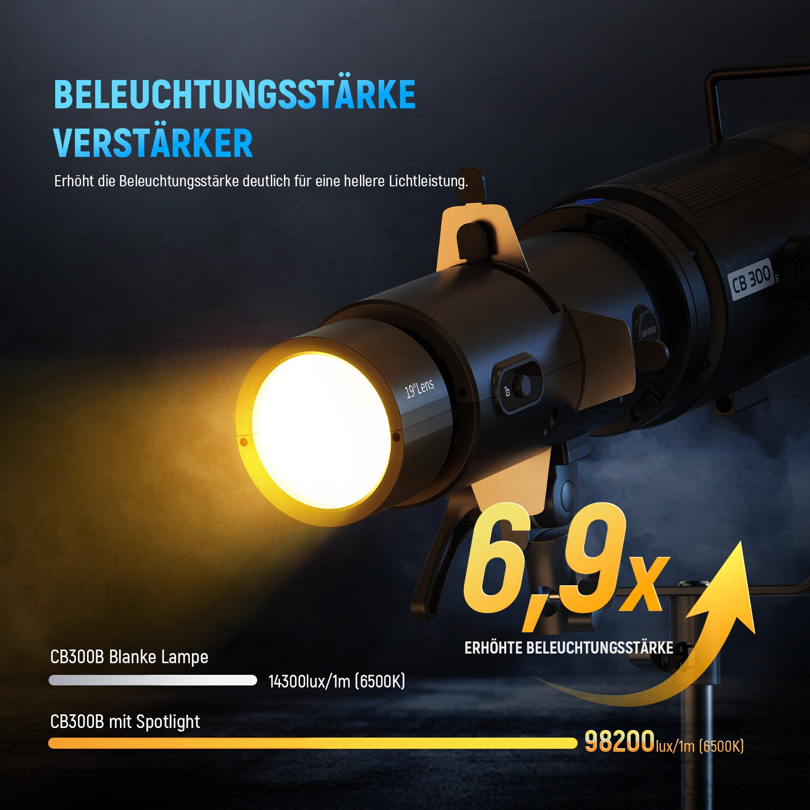 - Fortschrittlicher optischer Spotlight Snoot- Mit präzisen optischen asphärischen Linsen und fortschrittlicher Mehrschichtbeschichtungstechnologie bietet dieser Spotlight eine Lichtdurchlässigkeit von 98% für erhöhte Helligkeit und effiziente Lichtkonzentration. Ausgestattet mit einer 19° Projektionslinse erzeugt er klare Lichtpunkte mit gleichmäßiger Helligkeit und scharfen Kanten. In Kombination mit dem NEEWER CB300B erhöht es die Beleuchtungsstärke auf 1m um das 6,9X