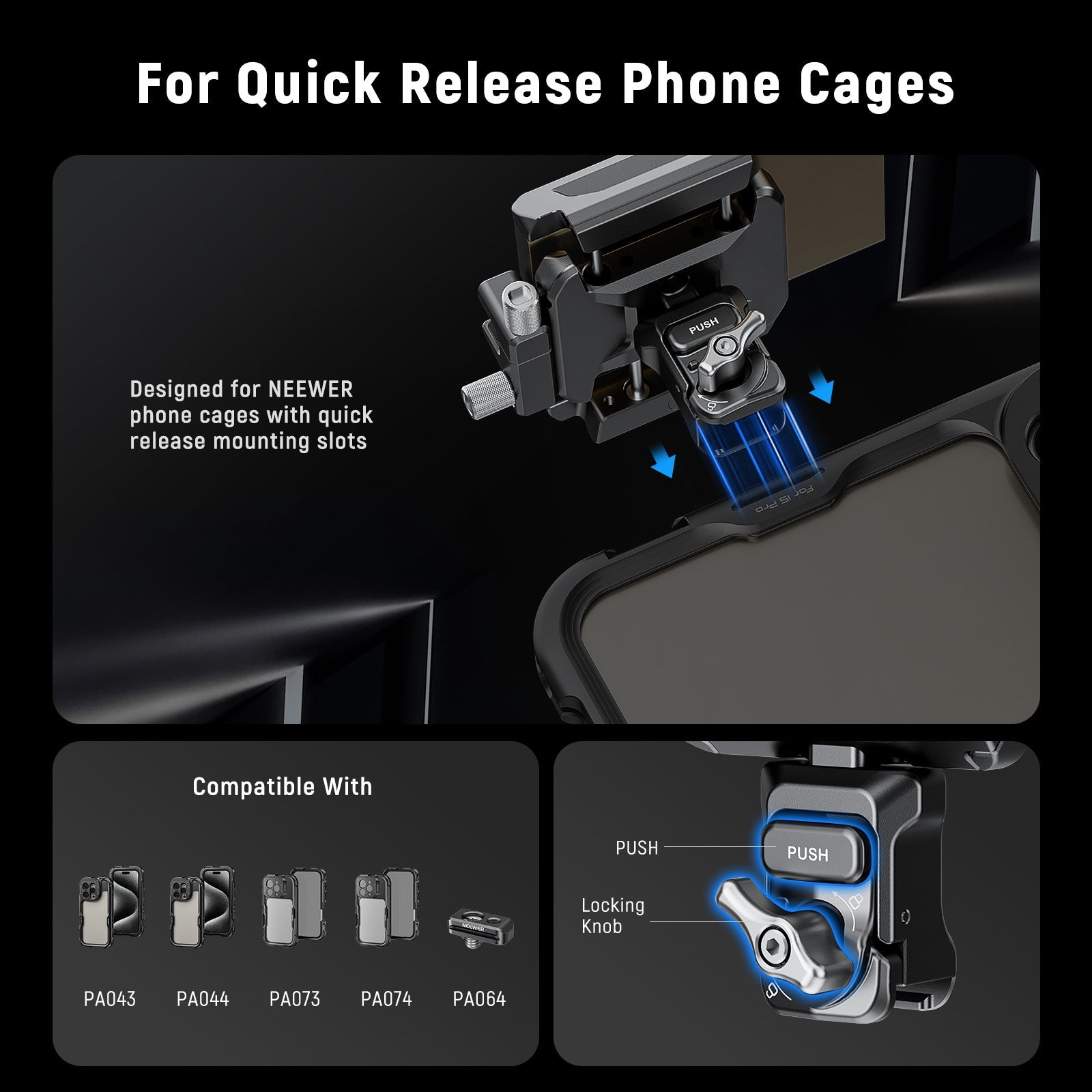 - Für Handykäfige mit Schnellverschluss- Entwickelt für NEEWER Handykäfige Zubehör mit Schnellverschluss Montageschlitzen, einschließlich PA073/PA074 für iPhone 16 Pro/Pro Max, PA043/PA044 für iPhone 15 Pro/Pro Max und PA042 für Samsung Galaxy S24 Ultra