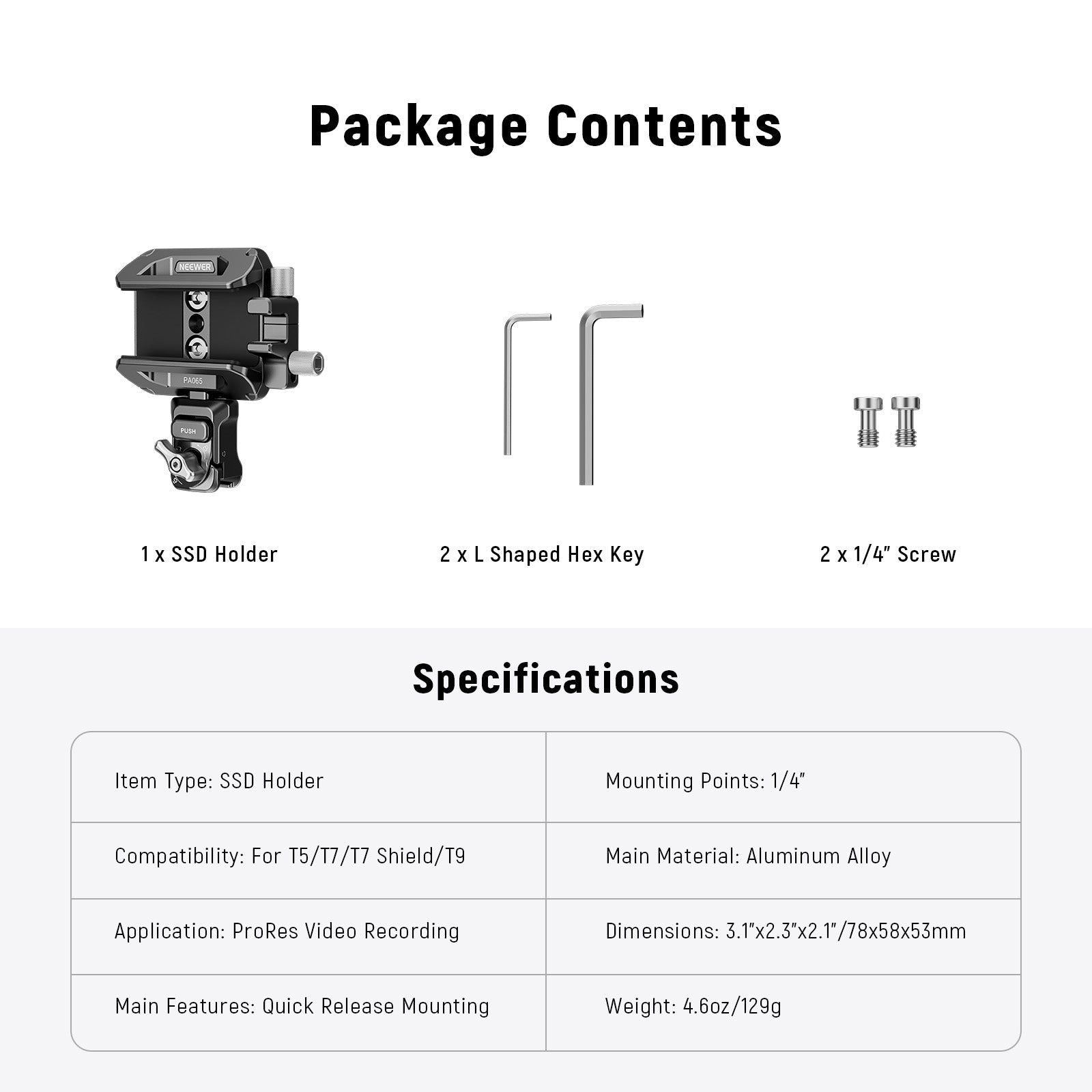 - Drei Einbauplätze für SSD- Die Schnellspannklemme unterstützt horizontale und vertikale Einbaurichtungen (für die vertikale Montage lösen Sie die Schnellspannklemme und befestigen Sie sie dann wieder an der Seite des SSD Holder). Verwenden Sie die beiden mitgelieferten 1/4" Schrauben, um den SSD Bracket an einem universellen Handykäfig (NEEWER PA009/PA017) zu befestigen. Auch kompatibel mit SmallRig Handykäfigen
