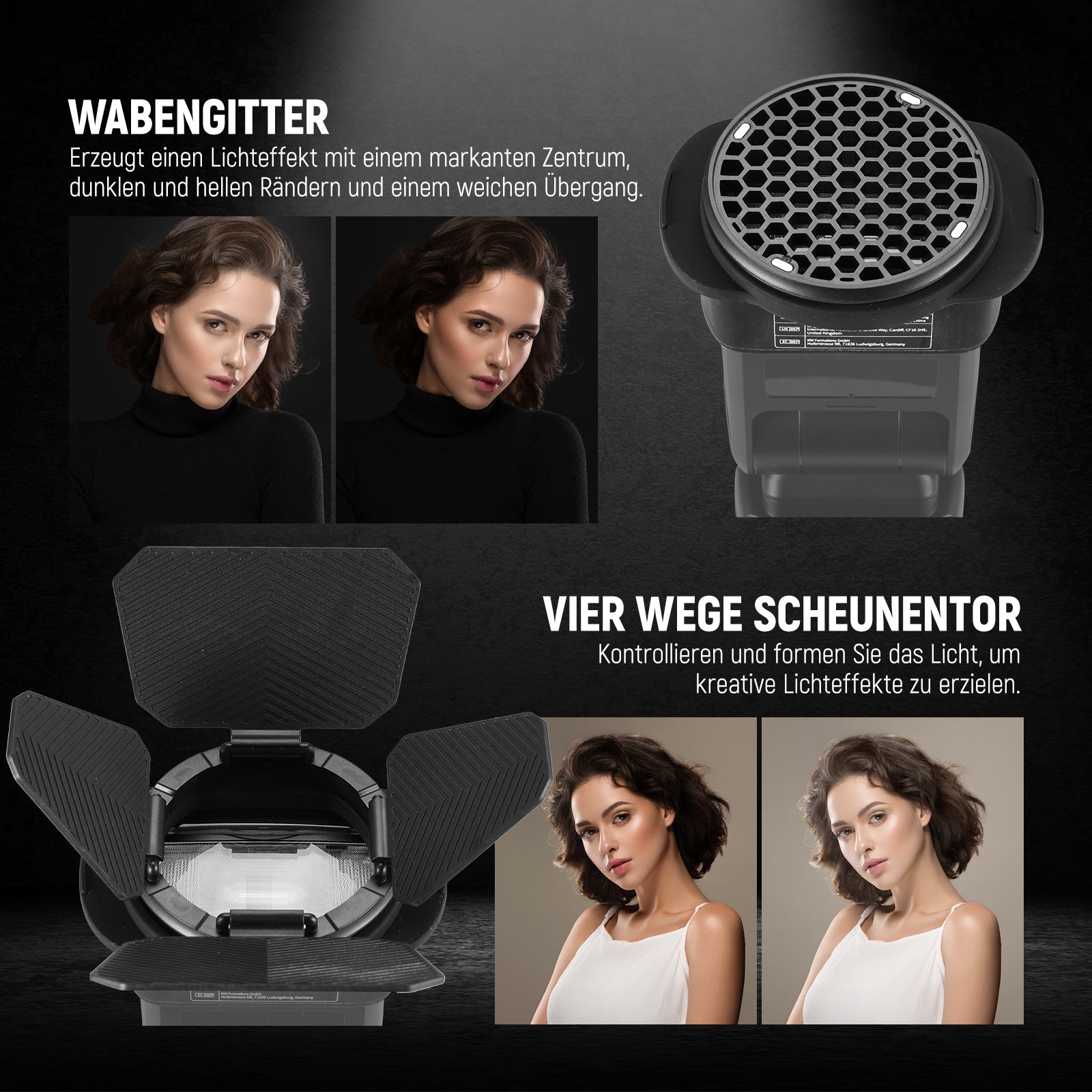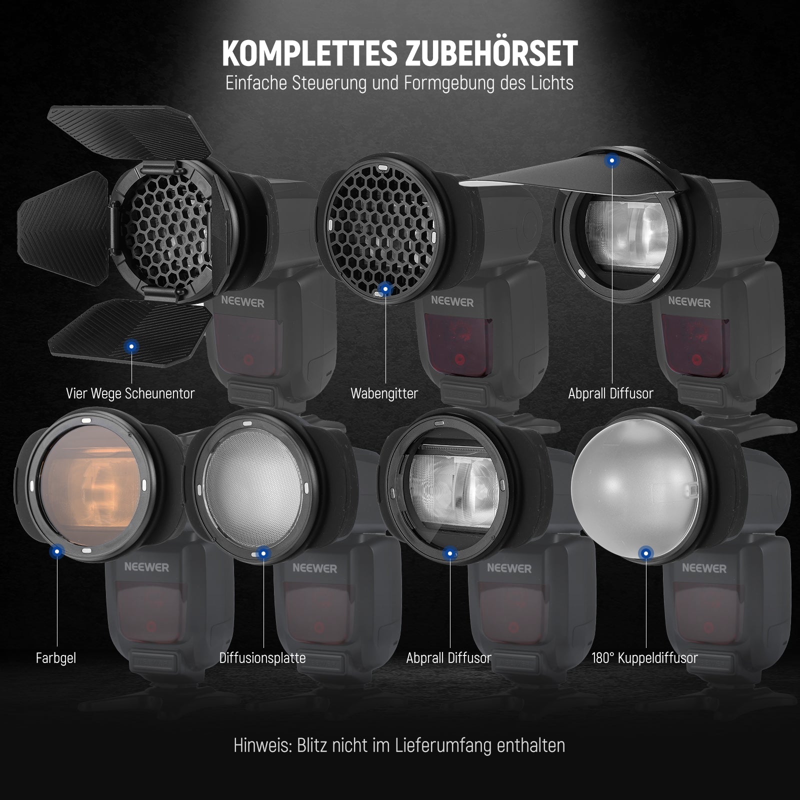 - Mühelose kreative Blitzeffekte- Die konische Spitze engt den Lichtstrahl ein, um Motive hervorzuheben, das Wabengitter verstärkt den Kontrast, um Konturen hervorzuheben, der Kuppeldiffusor und die Diffusionsplatte streuen und mildern das Licht, der Abprall Diffusor füllt Schatten auf, das vierseitige Scheunentoor formt das Licht, um es zu verteilen und Farbgele in drei Farben sorgen für verschiedene Farbtöne