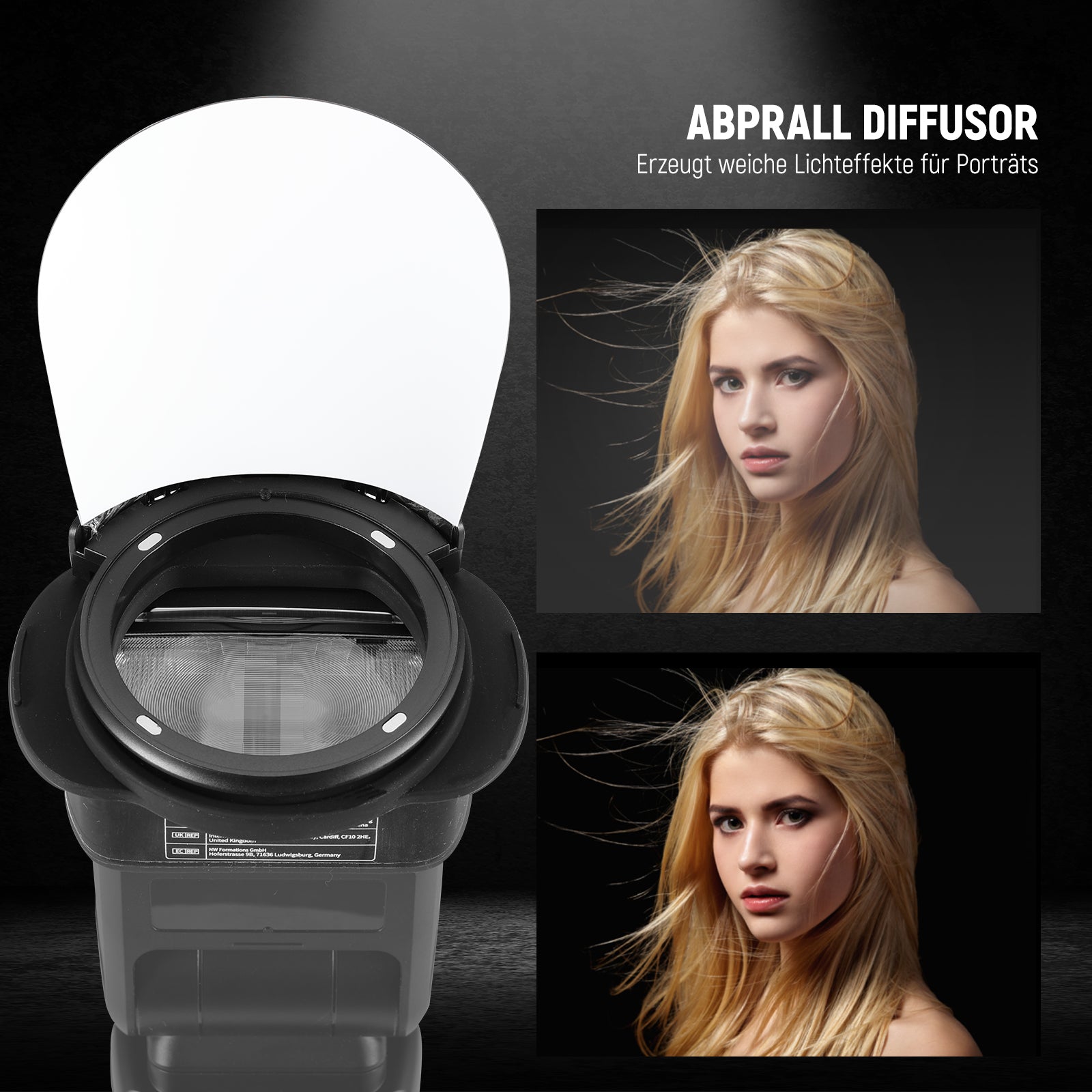 - Einfache magnetische Befestigung- Befestigen Sie diese Zubehörteile sicher und tauschen Sie sie einfach über Magnete aus. Verwenden Sie sie einzeln oder stapeln Sie sie für einzigartige Effekte. Zur Montage des Abprall Diffusors und der Farbgele sind ein Adapterrahmen und ein Adapterring im Lieferumfang enthalten