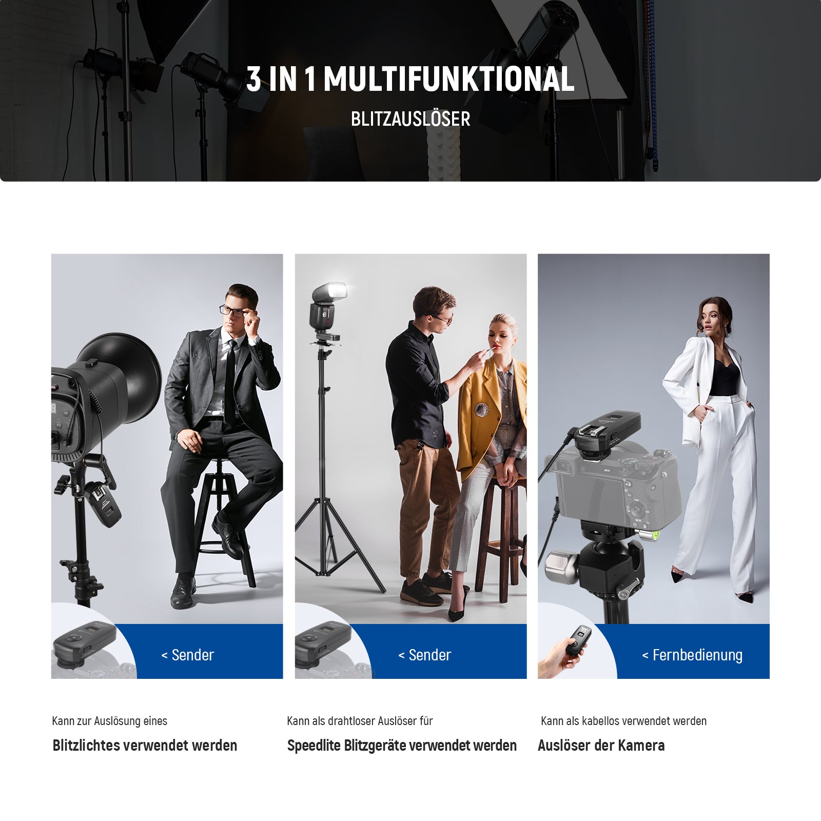- 3 in 1 Multifunktions Blitzauslöser- Dieser Blitzsender kann verwendet werden, um (1) die drahtlosen synchronen Studioblitze auszulösen, wie z.B. NEEWER S101-300W S101-400W S101-400W PRO Q300 Blitz; (2) Er kann als drahtloser Auslöser für Speedlite Blitzgeräte verwendet werden; (3) Er kann auch als drahtloser Auslöser für die Kamera verwendet werden