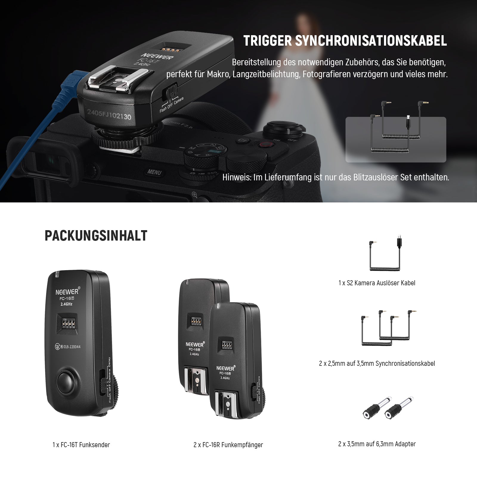 - 2,4GHz Mehrkanal Fernbedienung- Das Fernauslöser Empfängerset für Blitze arbeitet auf einer zuverlässigen 2,4GHz Funkfrequenz mit 16 wählbaren Kanälen und einer Blitzsynchronisationsgeschwindigkeit von bis zu 1/200s innerhalb von 25m und gewährleistet so eine stabile und störungsfreie Verbindung zwischen Ihren Blitzen und Ihrer DSLR Kamera. Unterstützt NICHT den TTL/HSS Modus