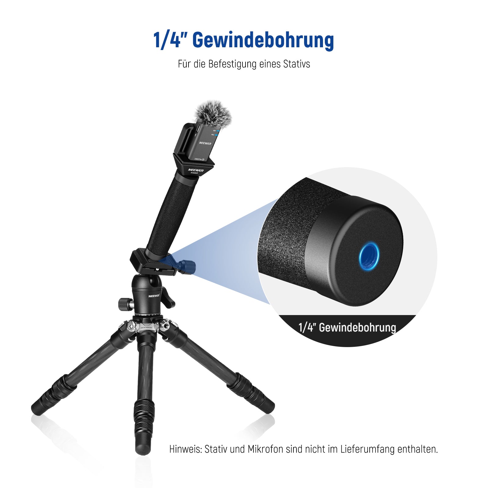 - Universelles 1/4" Montagegewinde- Ein unteres 1/4" Gewinde ermöglicht eine schnelle Verbindung mit Lichtstativen, Mikrofonständern, Stativen und anderen Halterungen mit 1/4" Schrauben