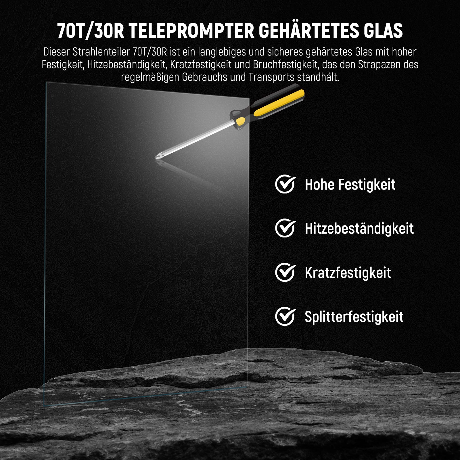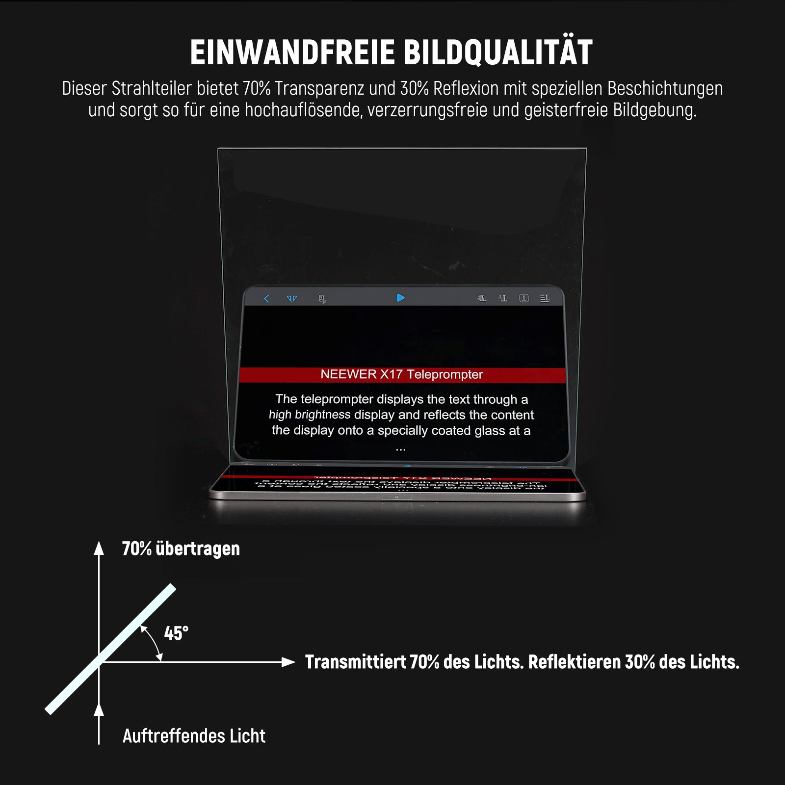 - 【Ausgezeichnete Bildqualität】 Dieser Strahlenteiler bietet 70% Transparenz und 30% Reflexionsvermögen mit speziellen Beschichtungen, die eine hochauflösende, verzerrungsfreie und geisterfreie Abbildung gewährleisten. Die Antireflexbeschichtung sorgt auch dafür, dass das Glas farbneutral bleibt, um die wahre Farbe des Inhalts beizubehalten, was es ideal für Teleprompter macht