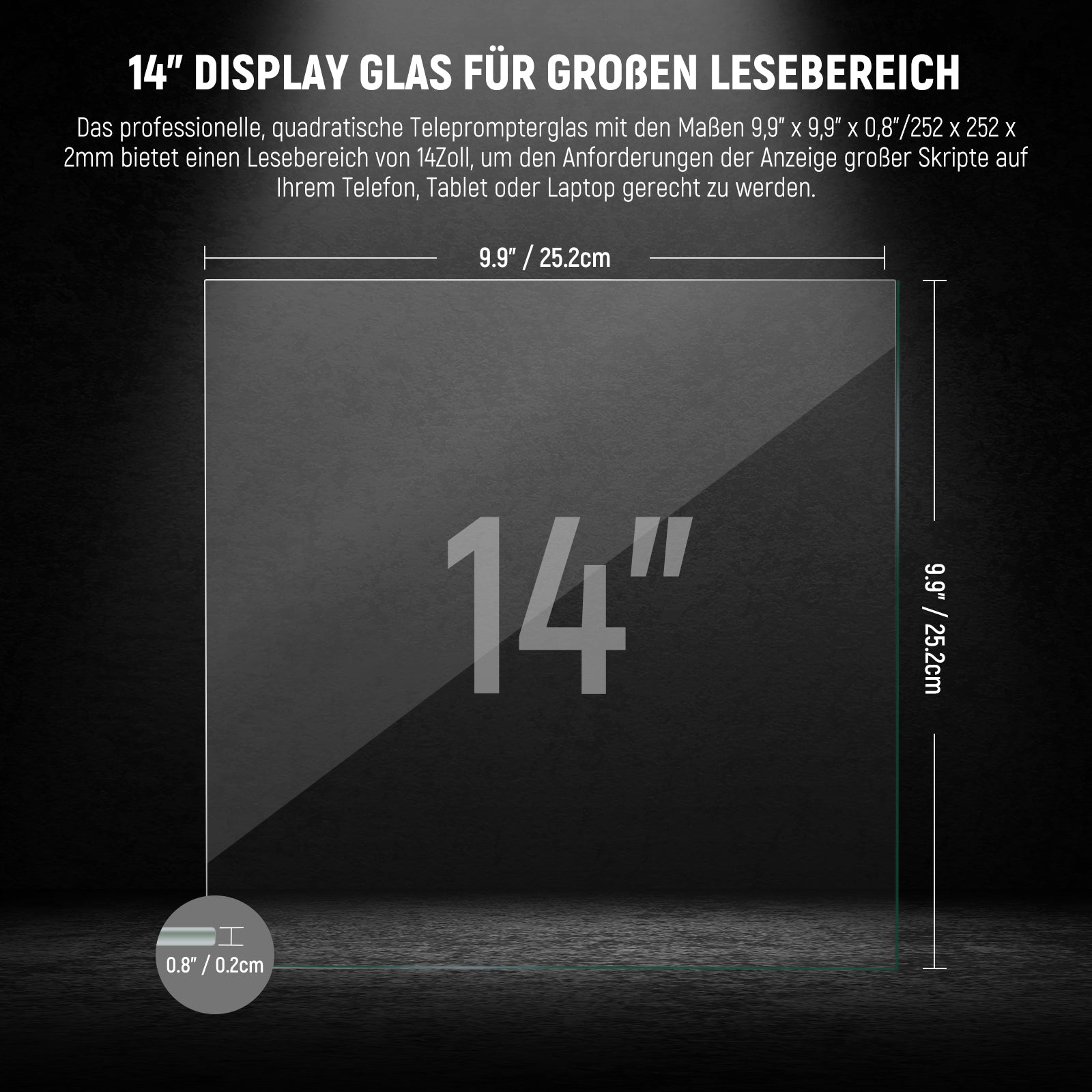 - 【14Zoll Displayglas für großen Lesebereich】 NEEWER Professional 9,9" x 9,9" x 0,8"/252 x 252 x 2mm Cube Teleprompter Glas bietet einen 14Zoll großen Lesebereich, um die Anforderungen an die Anzeige großer Schriften von Ihrem Telefon, Tablet oder Laptop zu erfüllen