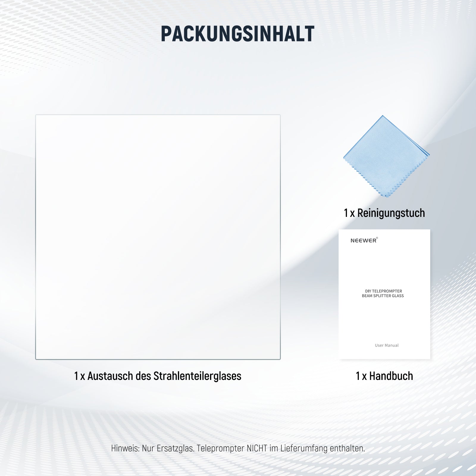 - 【DIY Teleprompter und Glasaustausch】 Der NEEWER NA14 Strahlenteiler ist ein einfaches, aber wichtiges Bauteil und eine kostengünstige Wahl für Ihre coolen DIY Teleprompter Projekte und den Austausch von zerbrochenem Glas. Wenn Sie eine komplette Teleprompter Lösung suchen, sollten Sie sich den NEEWER C12, X12, X14, X14 Pro, X14 II, X16, X17 II und andere ansehen