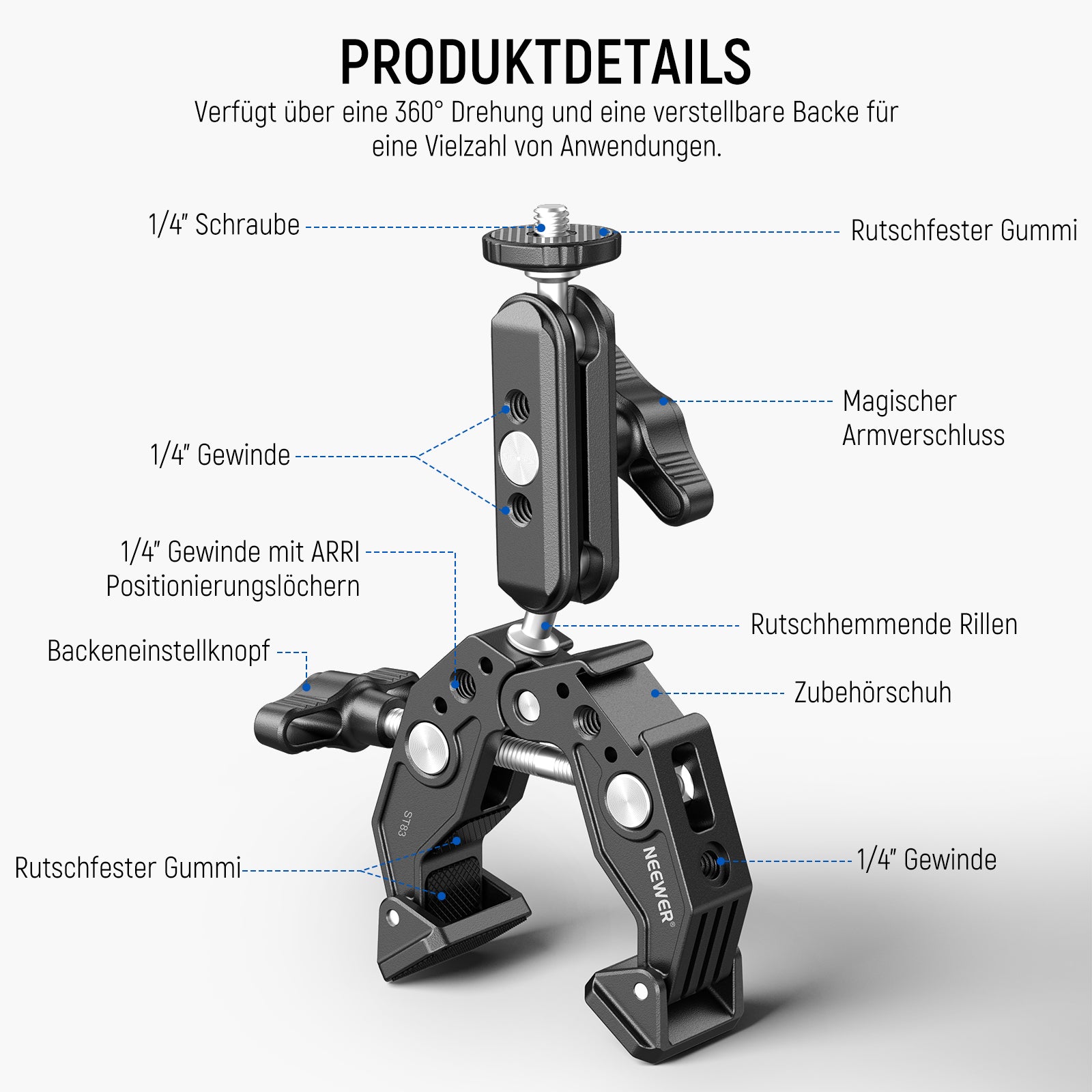 NEEWER ST83 Super Klemme mit 3" Dual Kugelkopf Magic-Arm