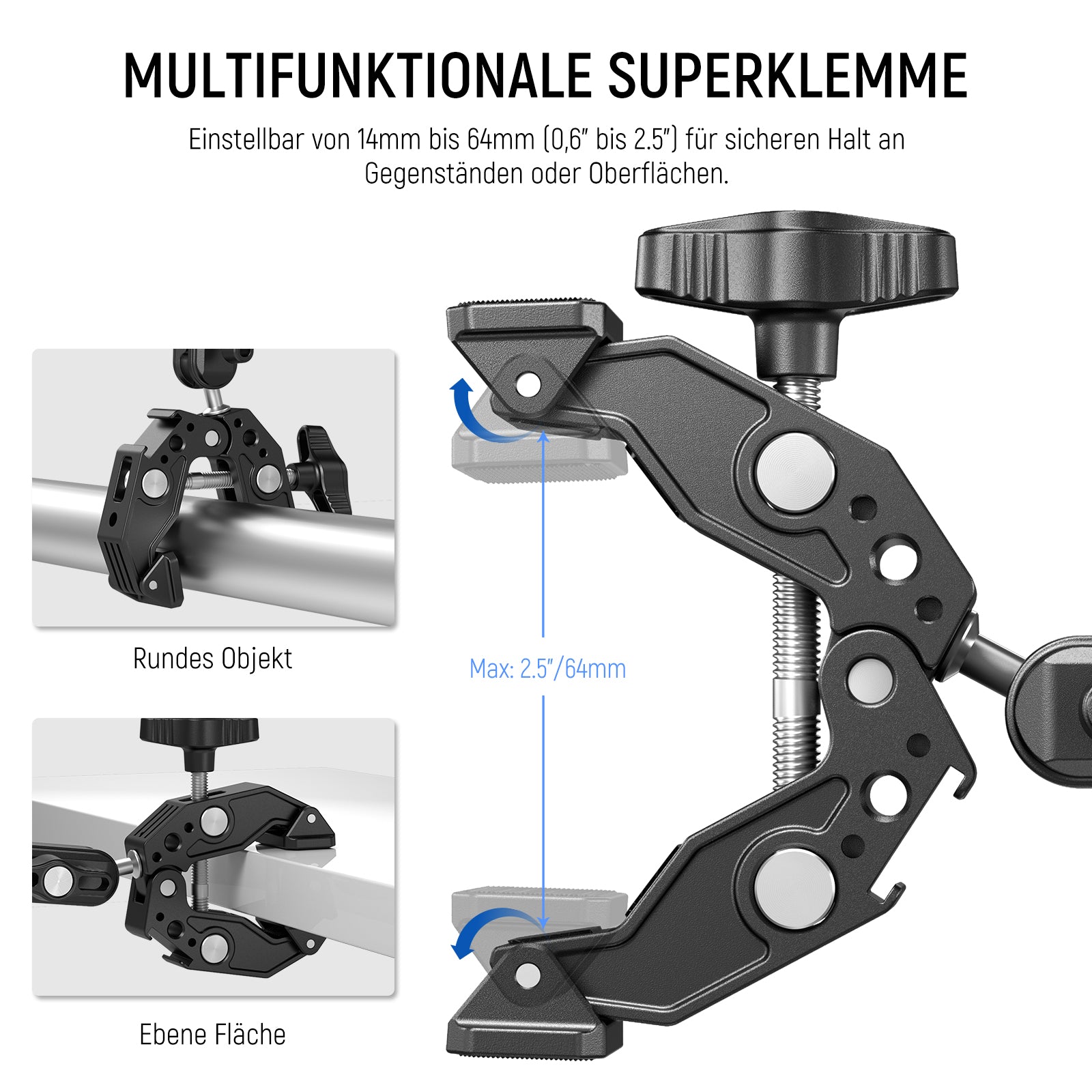 - 【Flache Oberflächen&runde Stangenklemme】Superklemme hält Objekte mit Durchmesser von 14–60mm sicher und eignet sich perfekt für flache Oberflächen wie Schreibtische und Stative, zylindrische Objekte wie Selfie Stöcke, Lichtstative, Schulterhalterungen und Fahrradlenker und mehr. Auch kompatibel mit Ronin M Ronin MX und Freefly Movi 25mm und 30mm Gimbal Stabilisierungsstangen. Die mit Silikongummi gepolsterten V Rillen und Drehspitzen sorgen für erhöhte Stabilität und verhindern Kratzer