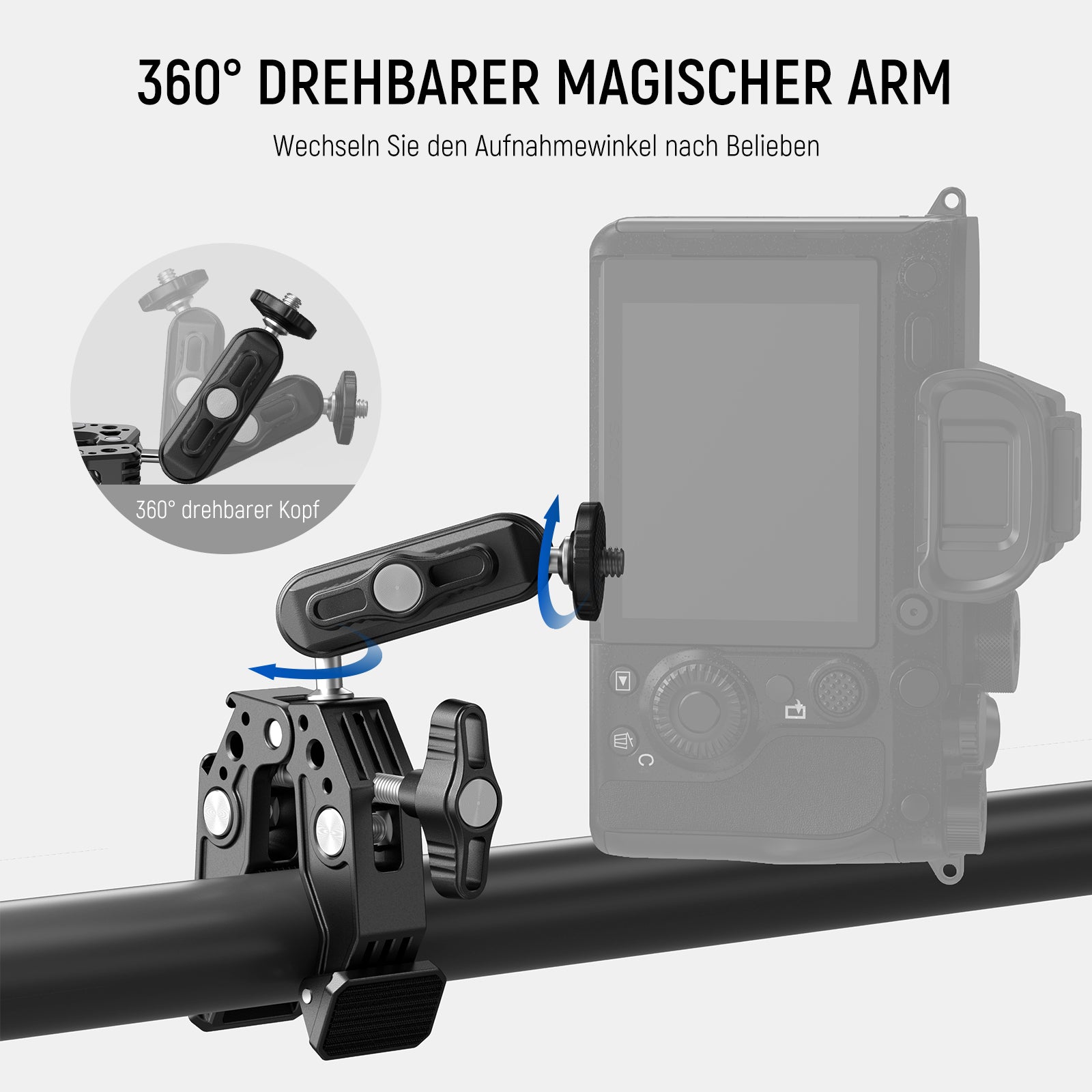 - 【Flexible Winkeleinstellung】 Die beiden um 360° drehbaren Kugelköpfe am 3"/7,62cm langen Magischen Arm können für optimale Aufnahmeflexibilität in jeden Winkel eingestellt werden. Der Schraubknopf ermöglicht eine schnelle und einfache Befestigung der Kugelköpfe