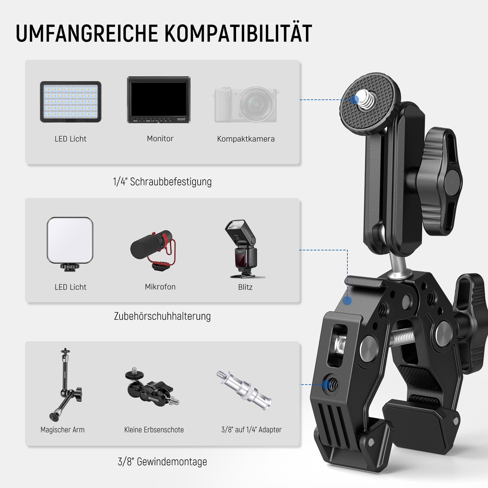 - 【Mehrer Befestigungspunkte】 Mit 1/4" Gewinden,3/8" Gewinden,ARRI Positionierungspunkten und einer integrierten Zubehörschuhhalterung können Superklemme und Magische Arm zahlreiche Zubehörteile wie einen Monitor, ein Schultergestell und einen Kamerakäfig anschließen. Ein abnehmbarer Blitzschuh Montageadapter kann einfach über eine 1/4" Schraube angebracht werden, um die schnelle Montage von LED Fülllichtern, Mikrofonen und mehr zu ermöglichen(nicht für Speedlite Blitze an der Kamera geeignet)
