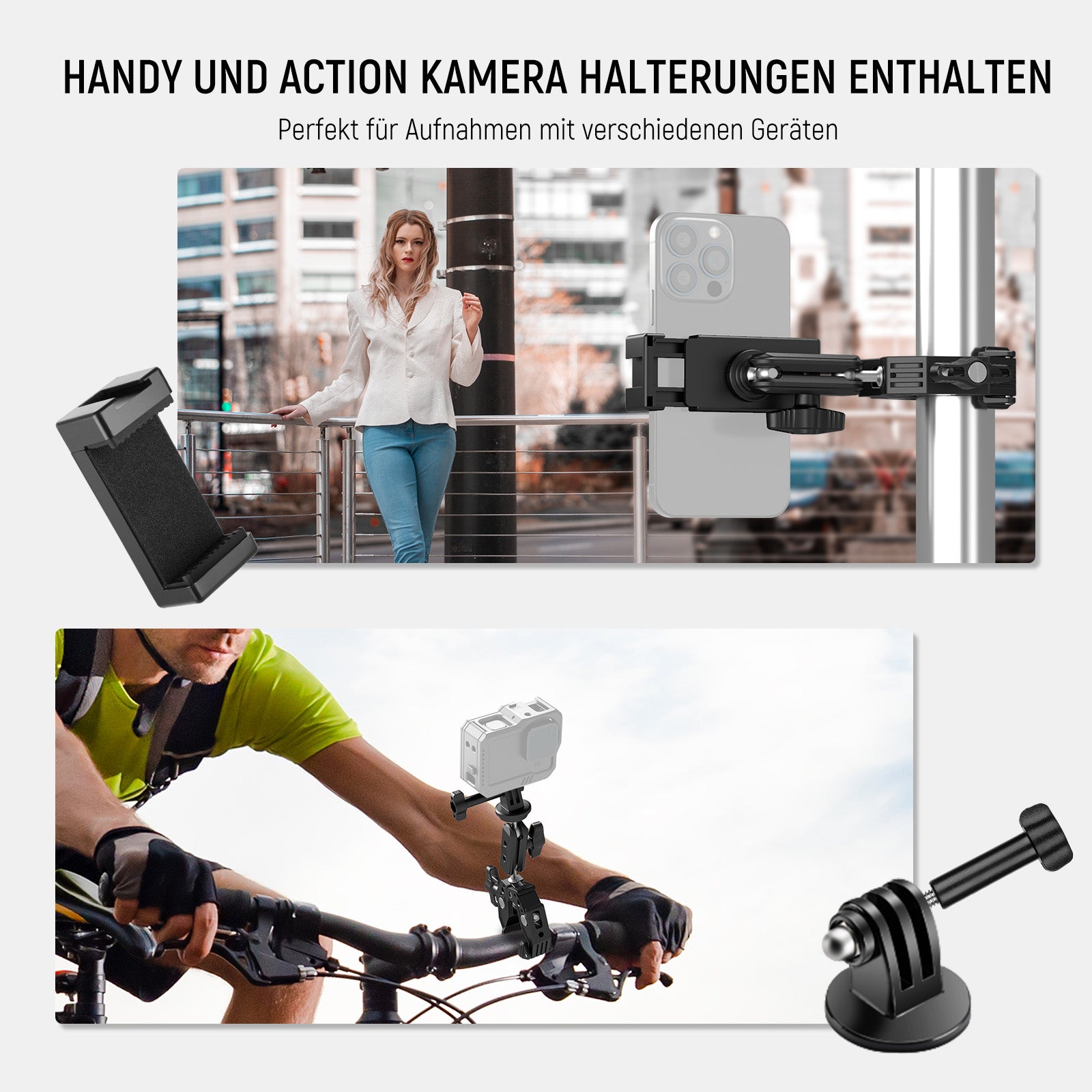- 【Camera & Phone Aufnahme】 Befestigen Sie sicher Ihr Smartphone mit einer Breite von 2,2"-3,3"/55-85 mm oder montieren Sie Ihre Action-Kamera mit den mitgelieferten Adaptern, kompatibel mit iPhone 15 Pro Max 14 13 12 11 Pro Max Plus Mini X Xs XR Samsung Galaxy S22 S23 Ultra Huawei P60 GoPro Hero 12 11 10 9 8 7 Black DJI Action 3 etc. Auch mit 1/4" Schraube zum Anschluss von Monitoren, LED-Leuchten, Mikrofonen und mehr. Die maximale Nutzlast ist 6.6lb (3.0kg)