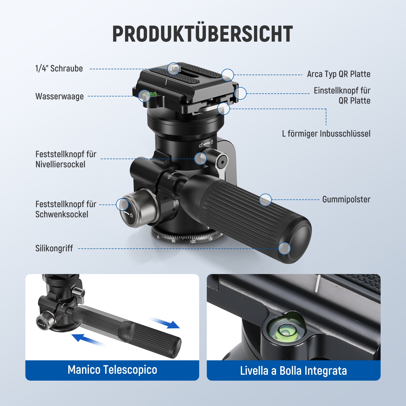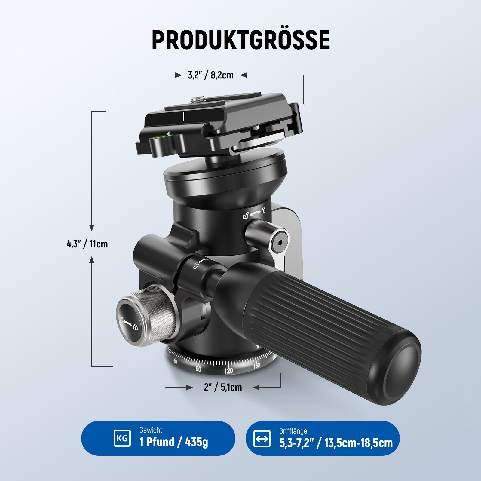 Einziehbare Griffe und 3/8" Gewinde-Ziehen Sie die Griffe aus, um mühelos zu neigen und zu schwenken und ziehen Sie sie ein, um sie platzsparend aufzubewahren. Das 3/8" Untere Gewinde ist kompatibel mit einer Vielzahl von Stativen, Einbeinstativen, Kamera Slidern und Kamerawagen