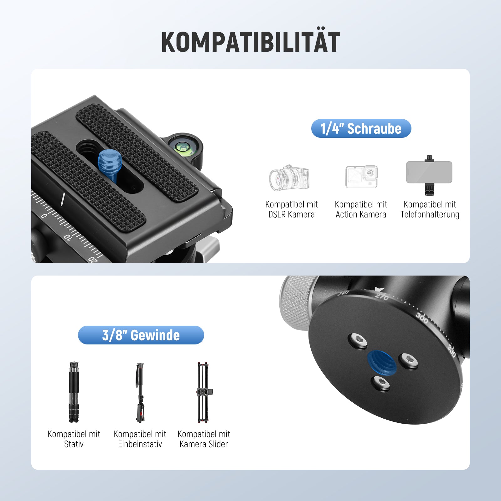 - 360° Panoramabasis-Verwenden Sie die professionelle Schwenkbasis, um die Kamera für Panoramafotografie und Videografie reibungslos zu schwenken. 360°Skalenmarkierungen helfen Ihnen, die Kamera mit hoher Genauigkeit zu drehen und ein Drehknopf kann die Kamera sicher an ihrem Platz arretieren