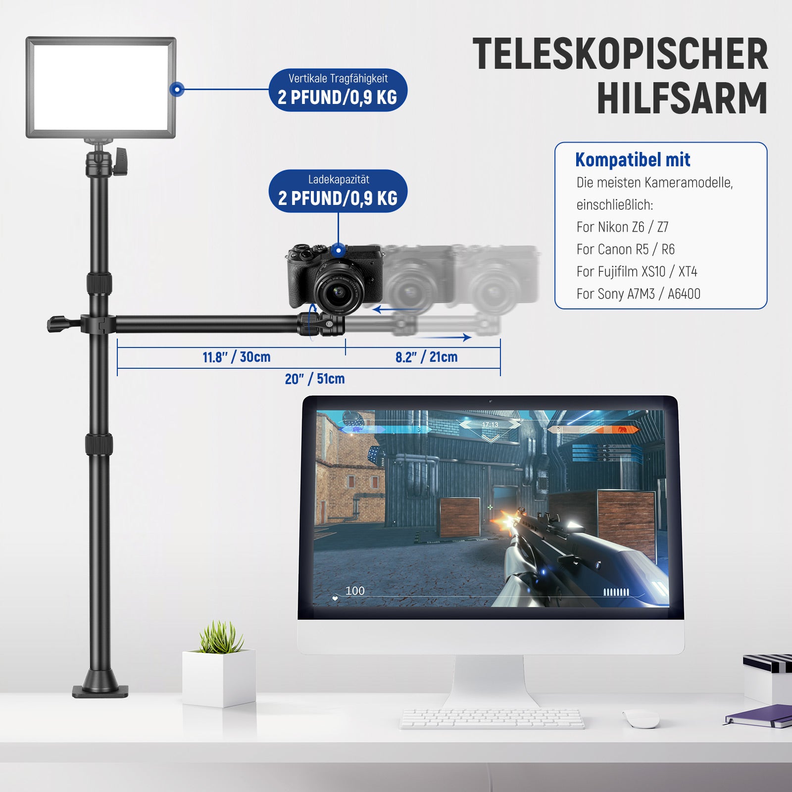- 2 teiliger horizontaler DS001 Haltearm- Der teleskopische Haltearm DS001 mit 2 Abschnitten ist von 11,8"-20" (30-51cm) ausziehbar und kann durch seine ovale Klemme horizontal am Schreibtischleuchtenständer montiert werden. Der Kugelkopf ist um 360° schwenkbar und die 1/4" Schraube kann Webcams und LED Leuchten mit einem Gewicht von bis zu 2lb (0,9kg) montieren
