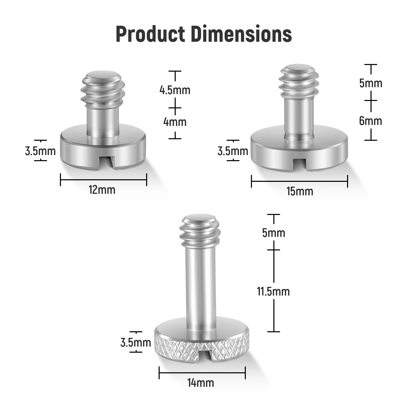- 【Schnellverschluss Ersatzschraube】 Befestigen Sie Ihre Kamera mit dem 1/4" Schlitzschraubensatz sicher an der Schnellwechselplatte. Die 1/4" Schrauben in 3 verschiedenen Größen mit jeweils 5 Stück, darunter befinden sich 16,5mm (5mm Gewinde, 11,5mm ohne Gewinde), 11mm (5mm Gewinde, 6mm ohne Gewinde) und 8,5mm (4,5mm Gewinde, 5mm ohne Gewinde), für jede Größe und zusätzliche Anzahl von Schrauben für Ihre Schnellspanner Bedürfnisse