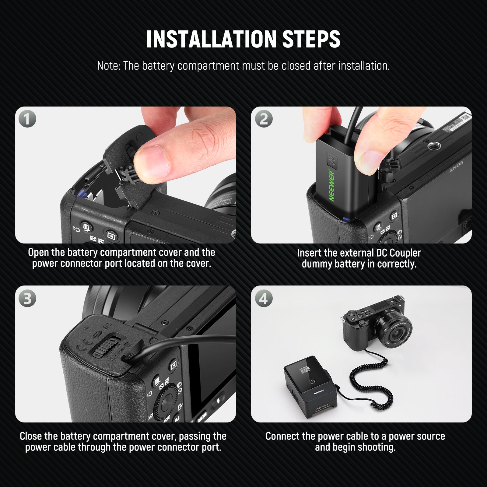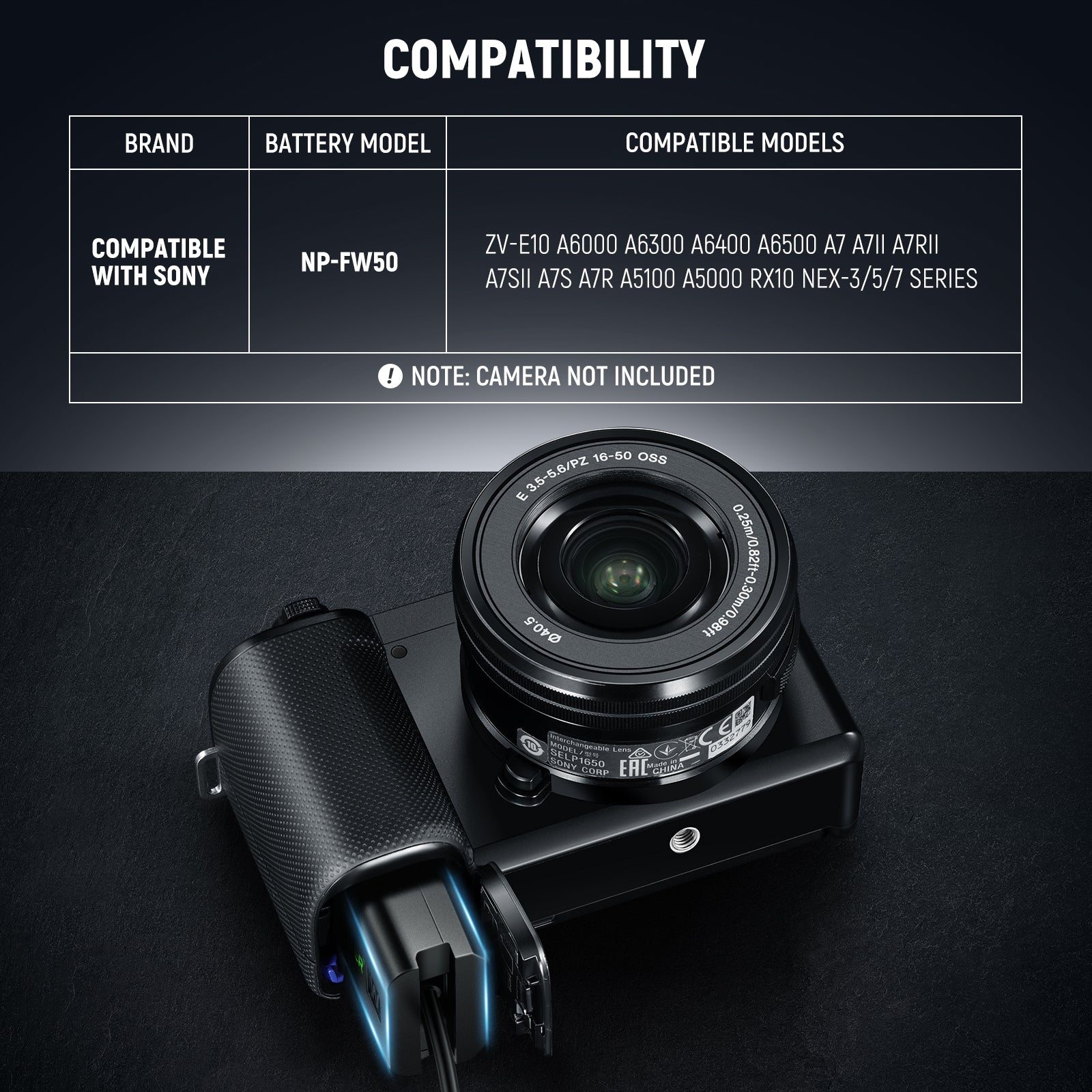 - 【Kompatible Gerätemodelle】 Dieser Dummy Akku ist ein Ersatzakku für Sony NP-FW50 und ist vollständig kompatibel mit Sony ZV-E10 A3000 A5000 A5100 A6000 A6100 A6300 A6400 A6500 A7 A7 II A7R A7R II A7S A7S II NEX-3 NEX-3N NEX-5 NEX-5N NEX-5R NEX-5T NEX-6 NEX-7 NEX-C3 NEX-F3 Kameras, die NP-FW50 Akkus akzeptieren