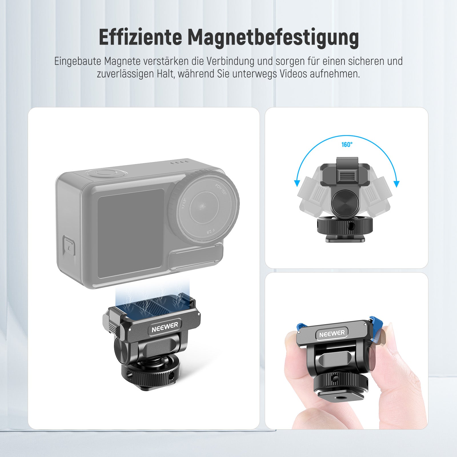 - Magnetische Cold Shoe Halterung- Die Schnellverschluss Cold Shoe Halterung kann sofort einrasten und die Befestigung mit den integrierten Magneten verstärken. Die um 160° verstellbare Neigung ermöglicht eine flexible Positionierung für vielseitige Aufnahmewinkel
