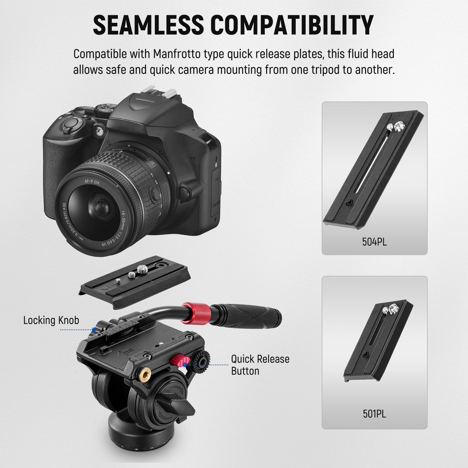- 【Leichter und fließender Panoramakopf】Dieser ultraleichte mittelgroße Flüssigkopf besteht aus einer Aluminiumlegierung und verfügt über ein hohles und aufwändiges Design, wiegt nur 1,5lb/0,69kg,wodurch er leicht zu transportieren und für die Kreation im Freien geeignet ist. Mit einer maximalen Tragfähigkeit von 13,2lb/6kg kann es schweren Camcordern und Video DSLR Kameras und unsicheren Wetterbedingungen standhalten