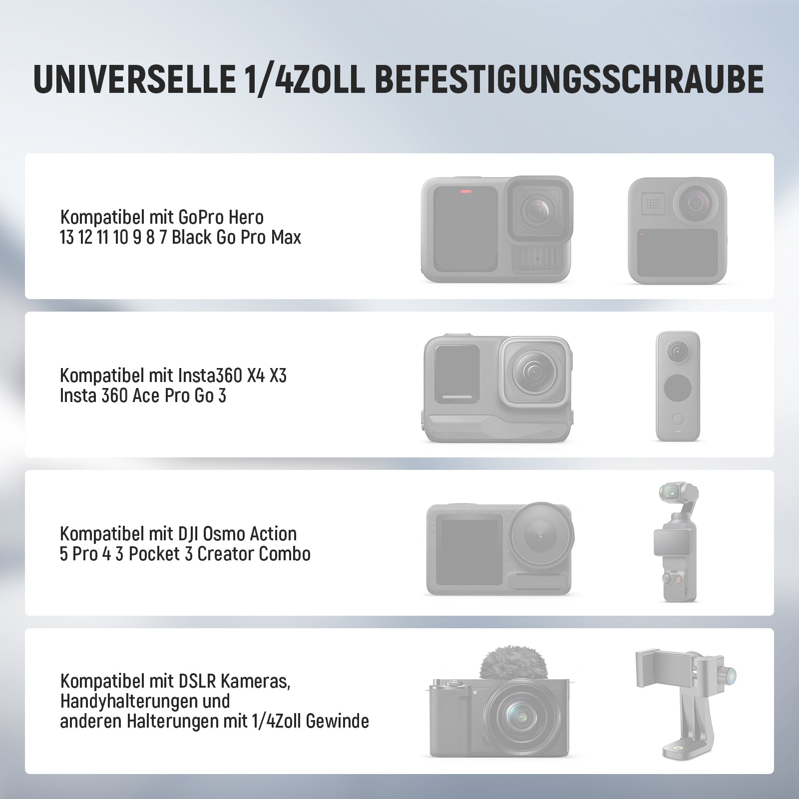 - Weitreichende Kompatibilität- Die Actionkamera Halterung ist kompatibel mit GoPro Hero 13 12 11 10 9 Black go pro max kompatibel mit DJI OSMO Action 5 Pro 4 3 2 kompatibel mit Insta360 X5 X4 X3 X2 GO3 S GO2 insta 360 Ace Pro kompatibel mit AKASO Brave 8 7 combos. Das 1/4Zoll Gewinde dient zur Befestigung von kleineren DSLR Kameras, Videokameras, Überwachungskameras, Camcordern, Videoleuchten, Mikrofonen, Handyhalterungen und weiterem Fotozubehör