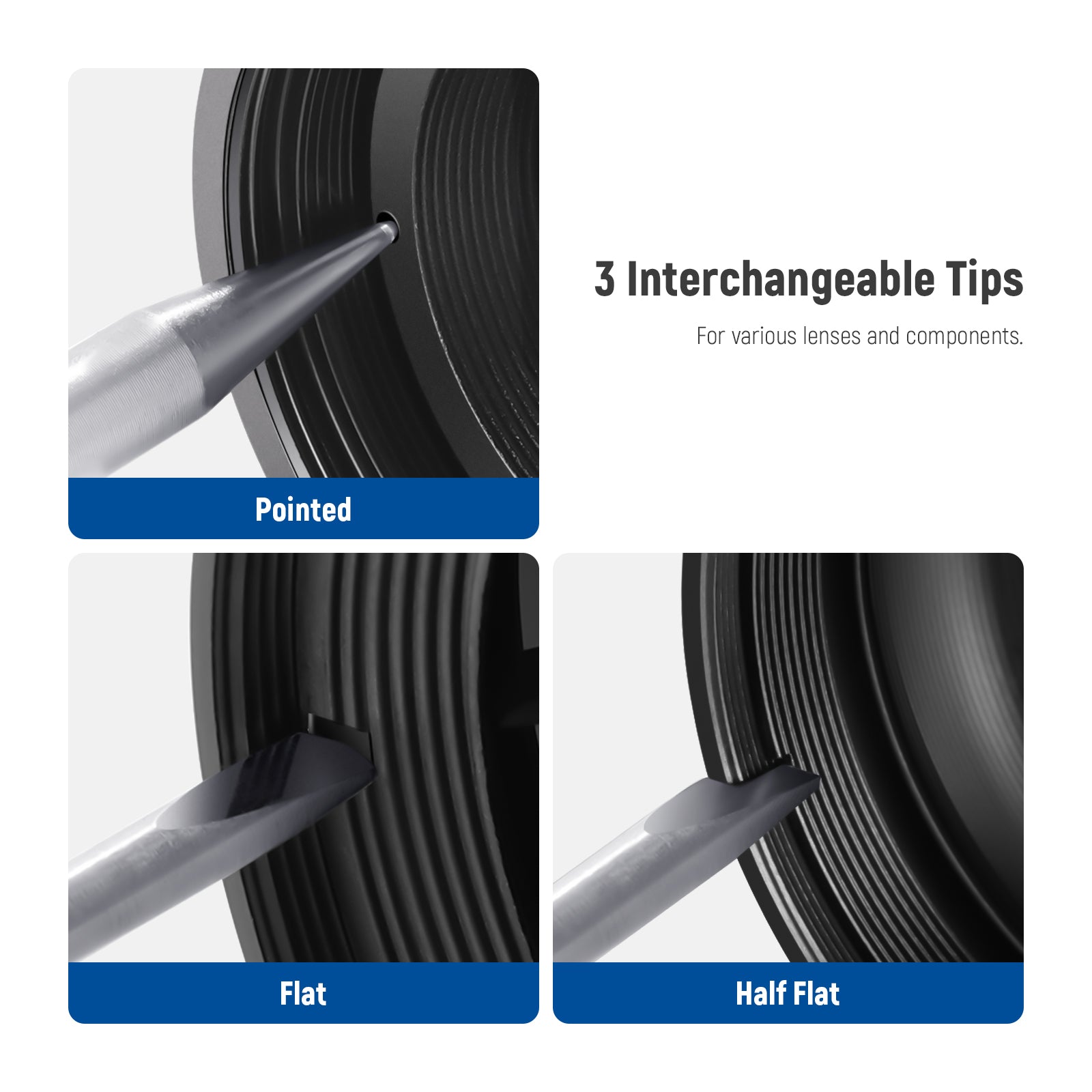• 【3 austauschbare Spitzen】 3 Arten austauschbarer Spitzen (spitz, flach, halb flach) sind für verschiedene Objektive und Komponenten geeignet