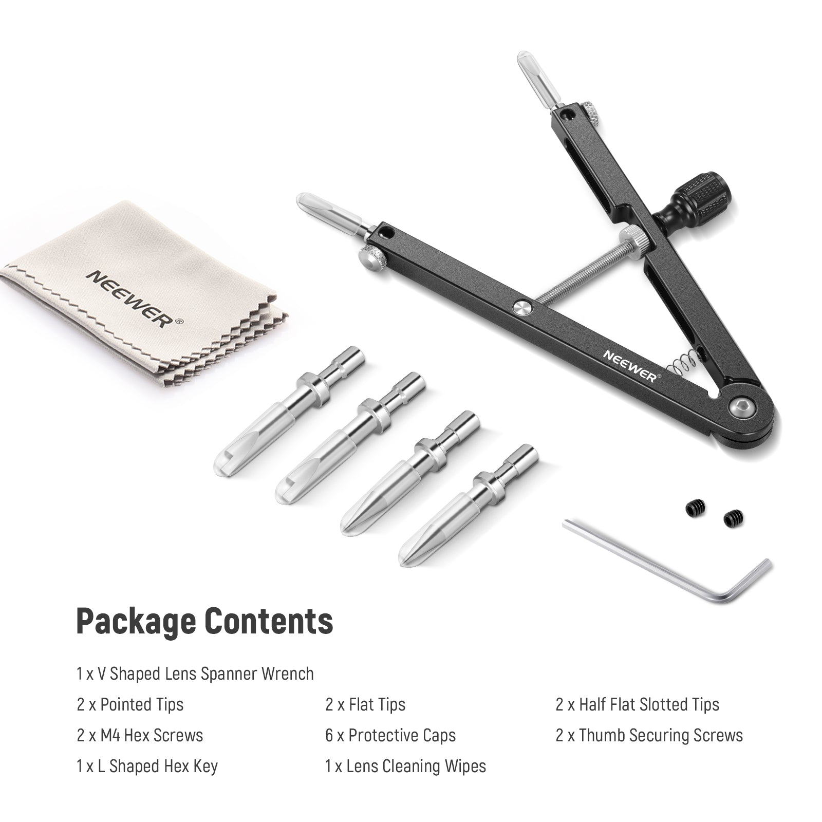 • 【Lieferumfang】1 x V förmiger Objektivschraubenzieher, 2 x spitze Spitze, 2 x flache Spitze, 2 x halbflache Spitze, 2 x M4 Sechskantschraube, 6 x Schutzkappe, 2 x Rändelschraube, 1 x L förmiger Sechskantschlüssel , 2 x Objektivreinigungstuch