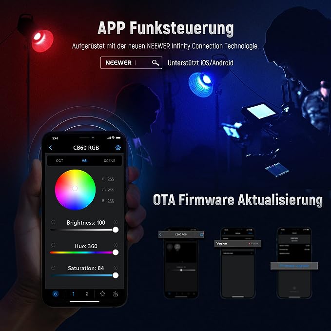 - Vielseitiges RGB Videolicht- Bietet 3 Lichtmodi: CCT Modus, HSI Modus und Szenenmodus. Mit einer Ausgangsleistung von 70W und einer maximalen Beleuchtungsstärke von 18.000 Lux bei 1m eignet es sich perfekt als Fülllicht oder Hauptlicht für Videografie, YouTube/TikTok Videoaufzeichnung, Filmproduktion und Live Streaming. Unterstützt Over the Air Firmware Aktualisierung (OTA), sodass aktualisierte Firmware per Funk von Ihrem Telefon an die Leuchte übertragen werden kann