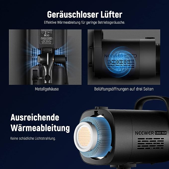- Extrem leiser Lüfter und Überhitzungsschutz- Der eingebaute, extrem leise Lüfter läuft automatisch mit niedriger Geschwindigkeit weiter, wenn das Licht verwendet wird. Erreicht die Leuchte eine bestimmte Temperatur, läuft der integrierte Kühlventilator schneller, um die Wärmeableitung zu fördern. Bitte beachten Sie, dass der Überhitzungsschutz aktiviert wird, wenn die Temperatur 70 °C überschreitet. Der gesamte Vorgang ist nahezu geräuschlos, perfekt für Videoaufnahmen