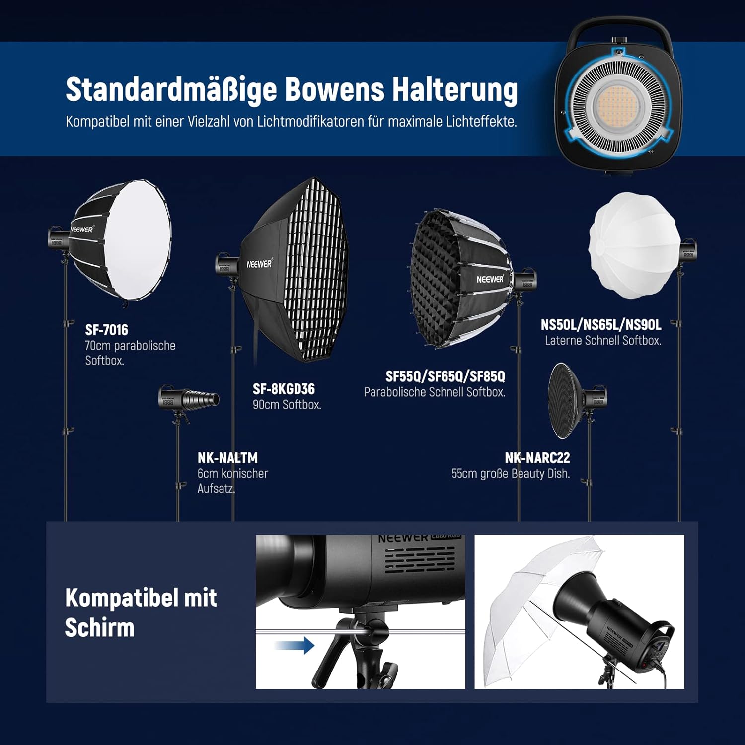 Universelle Bowens Halterung- Mit Standard Bowens Halterung und integriertem Schirmloch. Kompatibel mit einer Vielzahl von Lichtmodifikatoren, einschließlich Softbox, Reflektor, Beauty Dish, Aufsatz und mehr. Die Stativhalterung lässt sich stufenlos um 180° neigen und ermöglicht die einfache Einstellung der Lichtwinkel und bietet sichere befestigung am Stativ mit einem Feststellknopf. Es hat ein robustes Gehäuse aus Aluminiumlegierung und ist klein und kompakt
