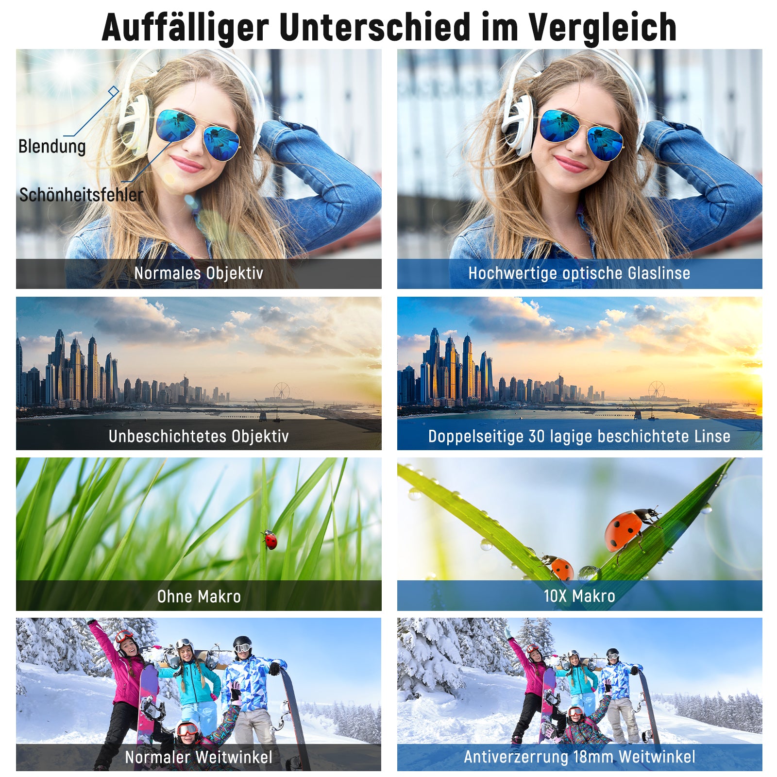 • 【Ultraweitwinkelobjektiv mit 18mm Brennweite】 Das 18mm Ultraweitwinkelobjektiv bietet ein Sichtfeld von 84 Grad, das einer Brennweite von 24mm im 35mm Format für den APS C Sensor oder den austauschbaren Mikro 4/3 Sensor entspricht. Es ist in der Lage, das Sichtfeld Ihres Objektivs je nach Brennweite Ihres Objektivs um das 0,43 bis 0,64 fache zu vergrößern. Hinweis: Das Weitwinkelobjektiv muss zusammen mit dem Makroobjektiv verwendet werden