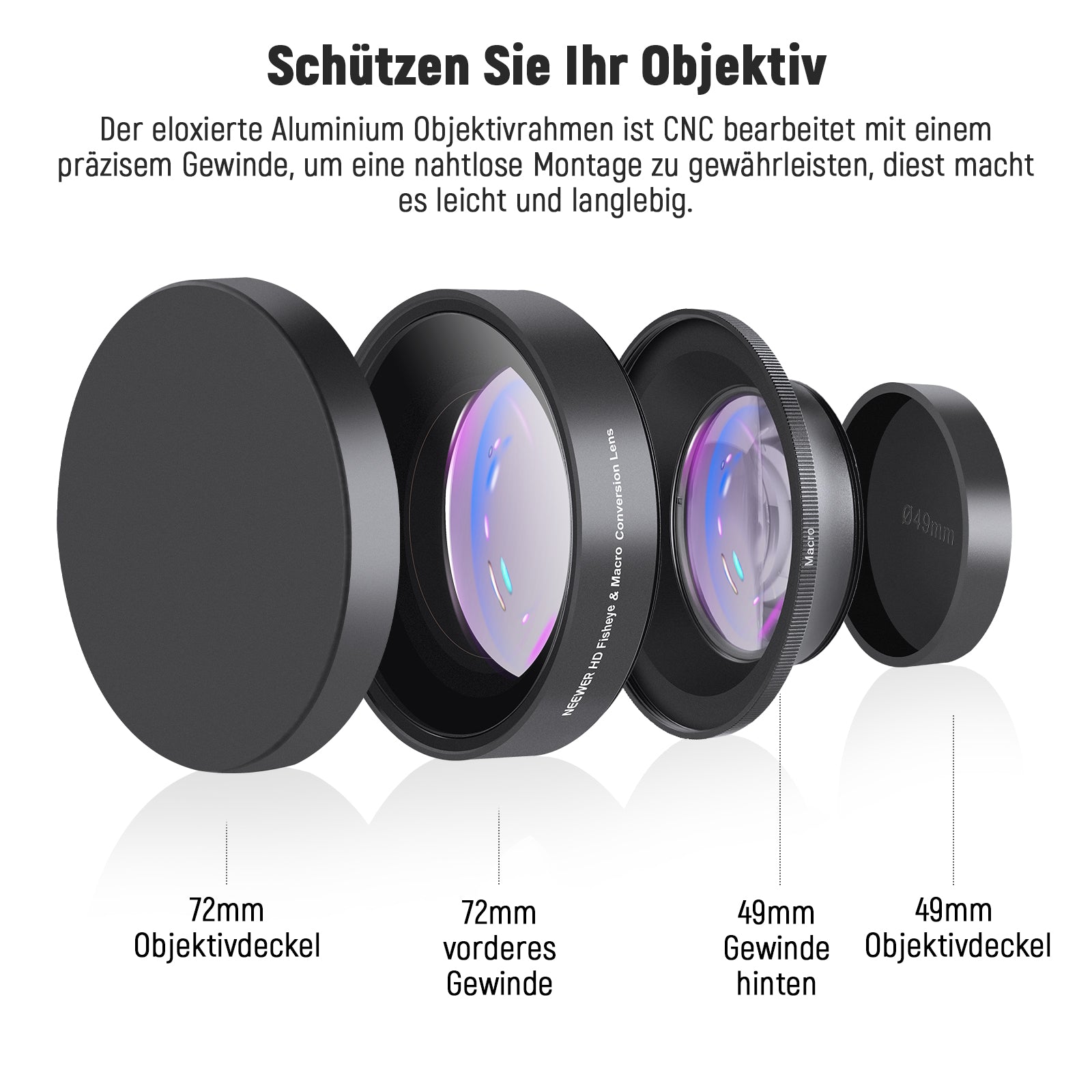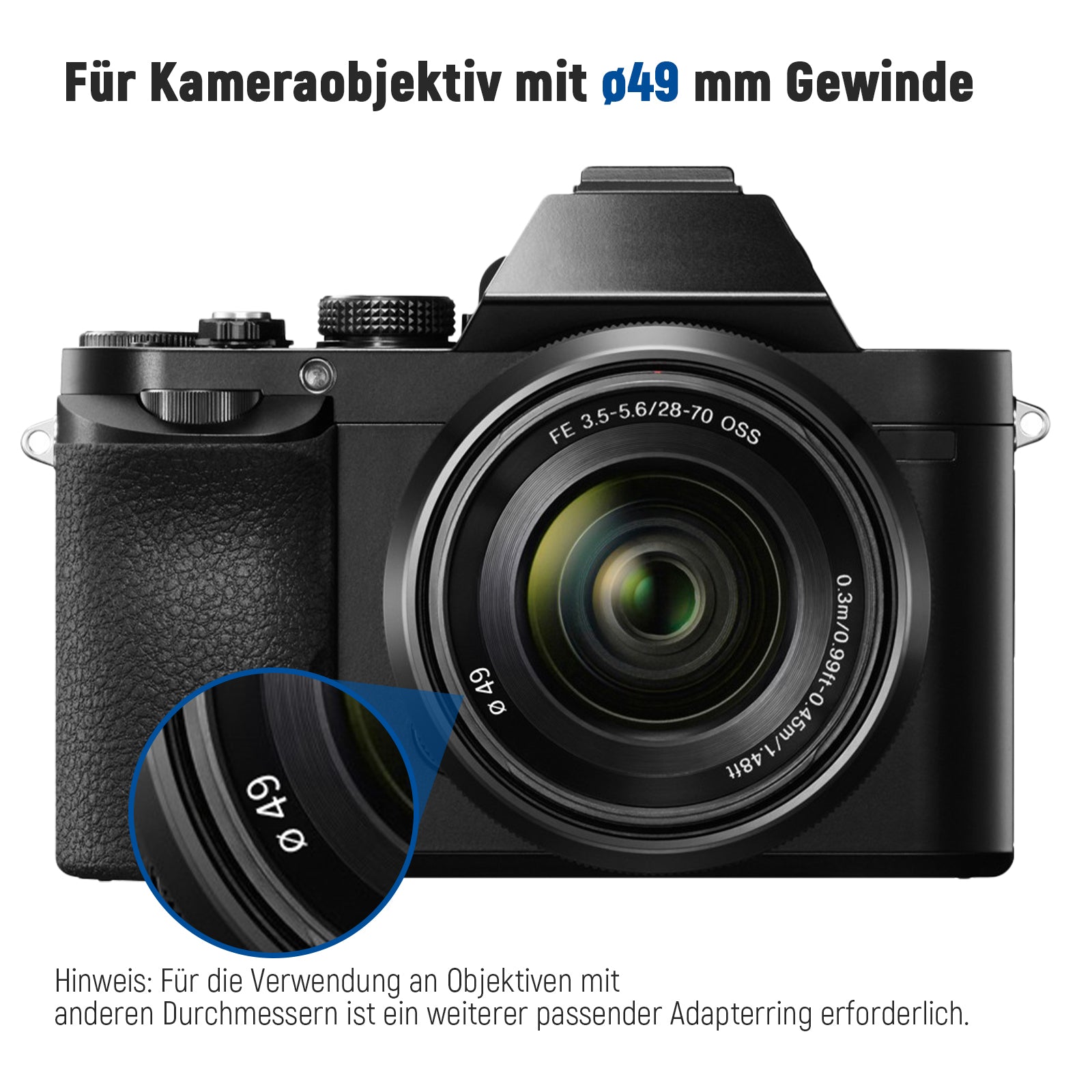 • 【Für Kameraobjektive mit Ø49 mm Gewinde】Kompatibel mit NIKON AF-S DX NIKKOR 55-200mm f/4-5.6G ED VR II or 35mm f/1.8G; Kompatibel mit CANON RF 35mm f/1.8 is Makro STM, EF-S 24mm f/2.8 STM, EF-M 55-200mm f/4.5-6.3 IS STM or 30mm F1.4 Contemporary DC DN; Kompatibel mit Sony E SIGMA 30mm F1.4 Contemporary DC DN FUJIFILM XC 15-45mm f/3.5-5.6 OIS PZ or XF 35mm f/1.4 R, usw. Hinweis: Die Verwendung von Objektiven mit anderen Durchmessern erfordert den zusätzlichen Adapterring (nicht enthalten)