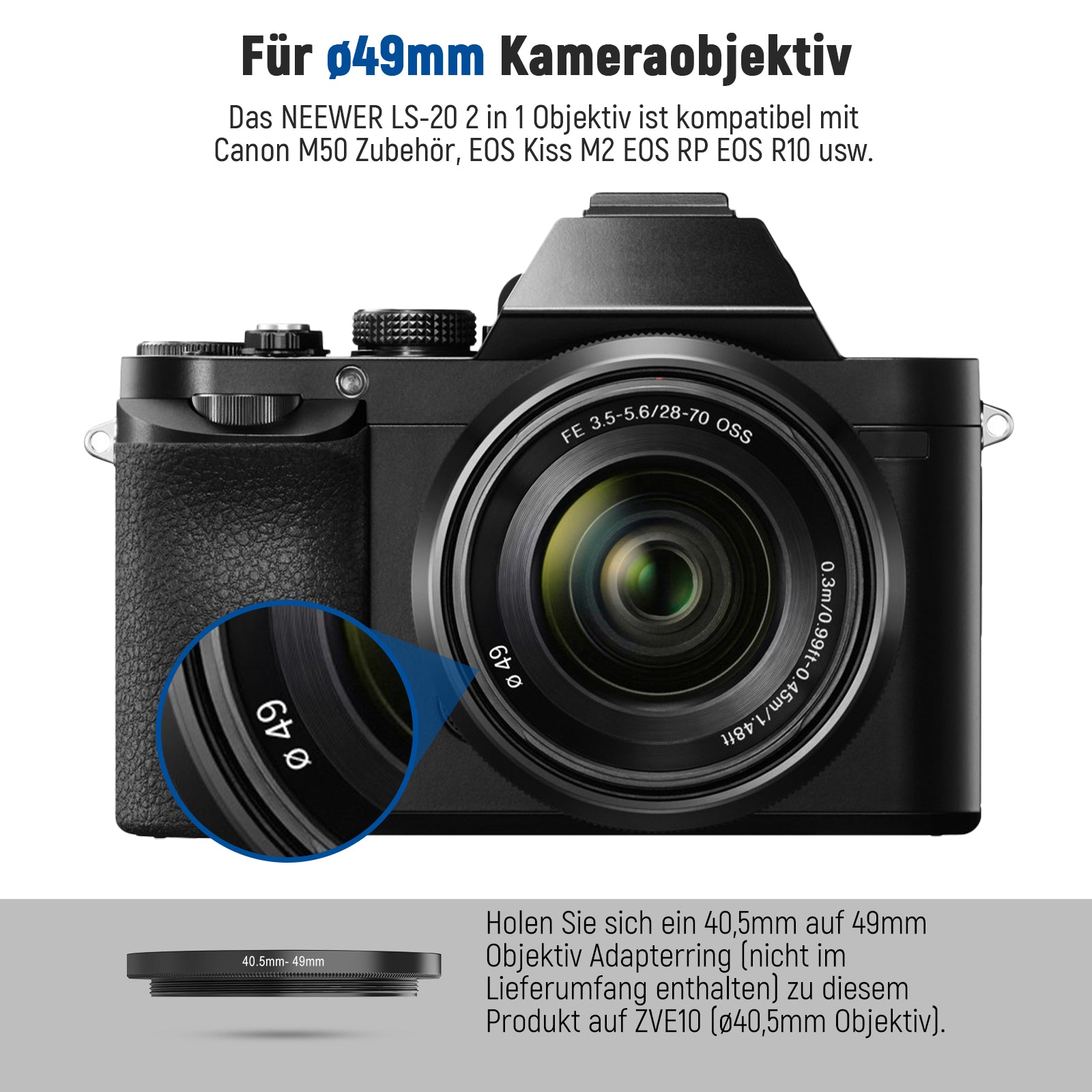 • 【2 in 1 Weitwinkel /Makrokameraobjektiv】Weitwinkelobjektiv mit einer kleineren Brennweite bietet ein größeres Sichtfeld, um mehr von Szene zu erfassen, während Makroobjektiv das Motiv vergrößert, um mehr Details zu zeigen. Das NEEWER LS-20 2 in 1 Objektiv kann beides und ist kompatibel mit Canon M50 Zubehör EOS Kiss M2 EOS RP EOS R10. Holen Sie sich einen 40,5mm auf 49mm Objektivadapterring(nicht enthalten), um dieses Produkt an ZVE10 (Ø40,5mm Objektiv) A6400 A7 IV Nikon Z50 und weitere Kameras