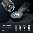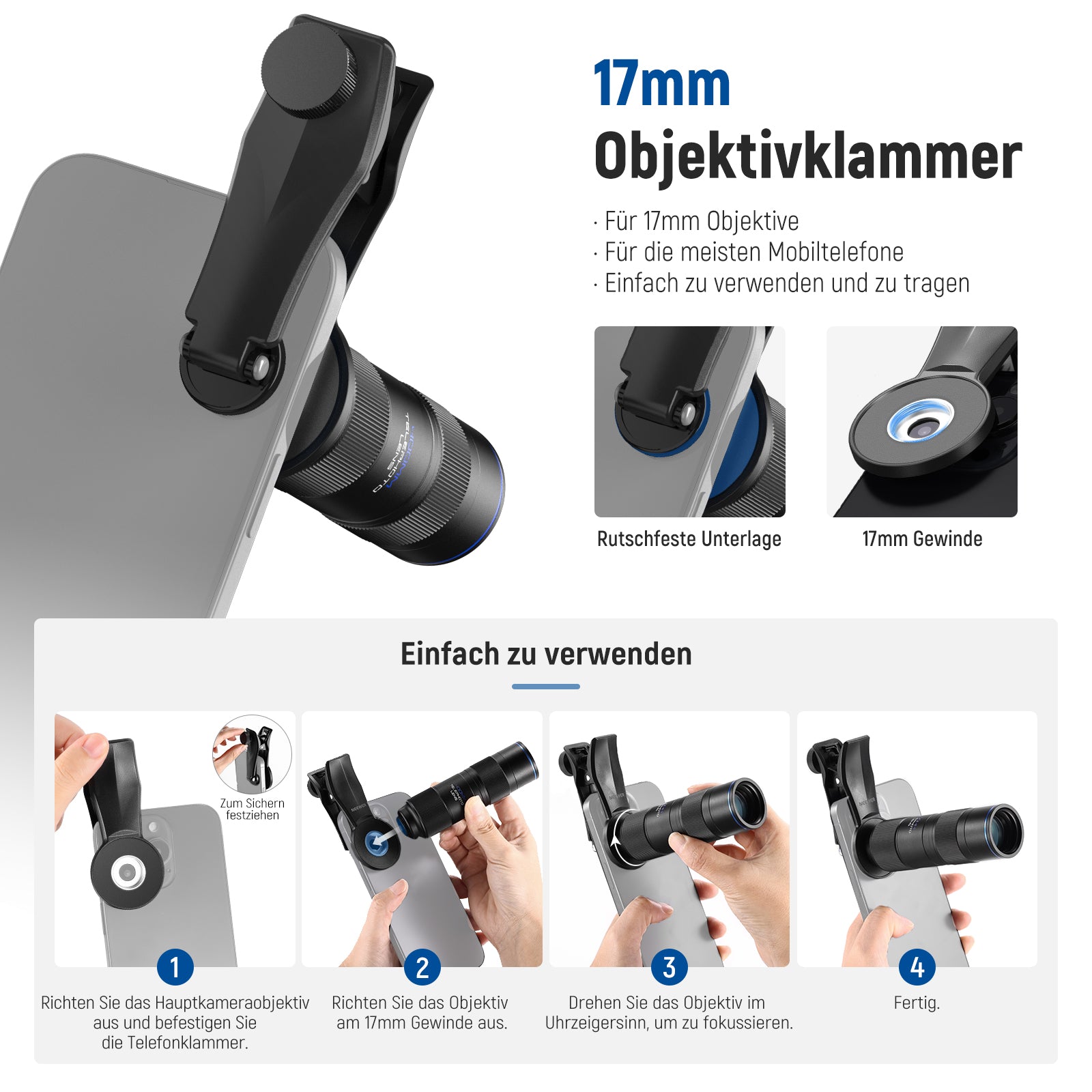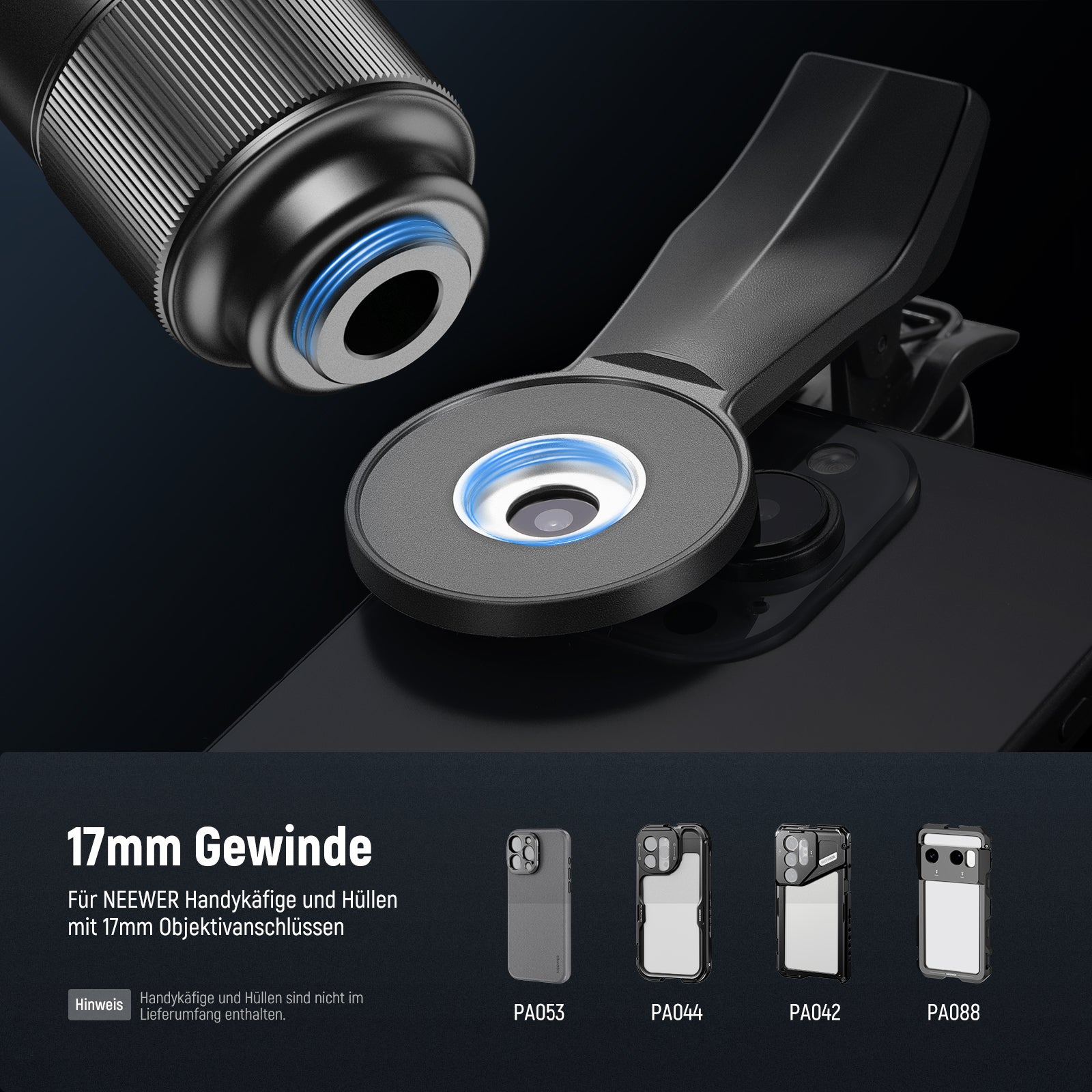 - 17mm Gewinde Handy Objektiv Clip für Mobiltelefone- Der Objektivclip für Smartphones ermöglicht eine sichere Befestigung des Objektivs an einem Smartphone und ist kompatibel mit iPhone17Pro/Pro Max ,iPhone 16 Pro Max, 15 Pro Max, 14, 13, Galaxy S25 Ultra, S24 Ultra und weiteren Modellen. Das Telezoomobjektiv als Makroaufsatz eignet sich auch für NEEWER Handykäfige, Handyhüllen und Rückplatten mit 17mm Gewinde