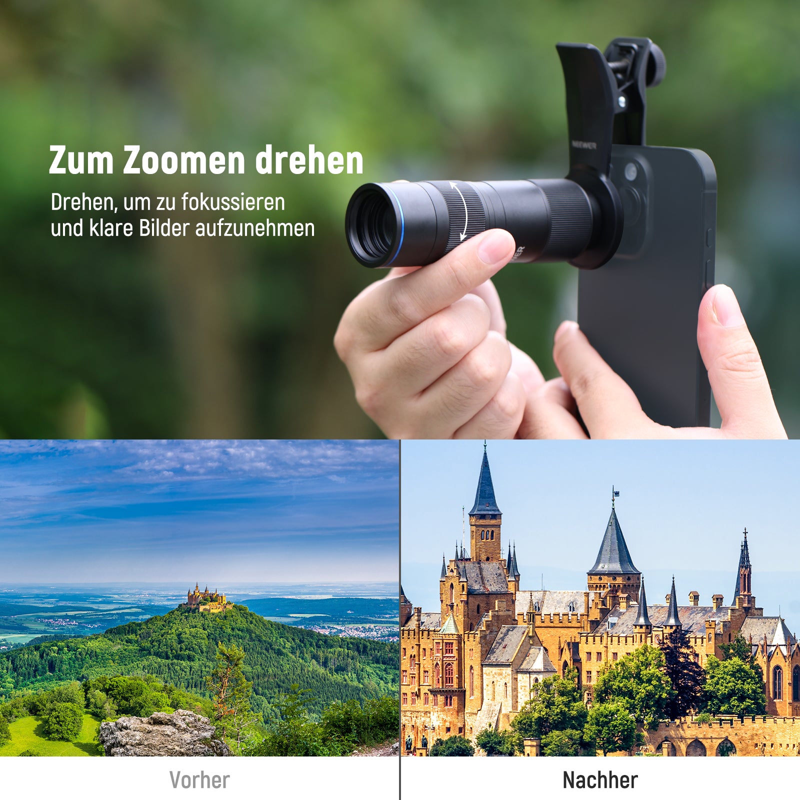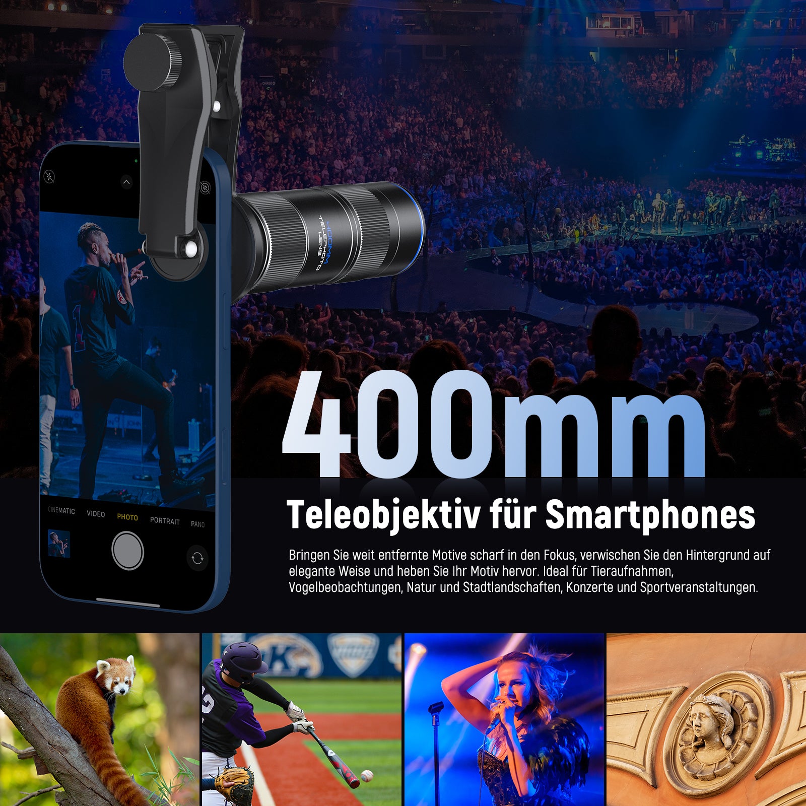 - 400mm Telephoto Lens für Smartphones- Bringen Sie weit entfernte Motive scharf in den Fokus, verwischen Sie den Hintergrund auf wunderschöne Weise und heben Sie Ihr Motiv hervor – ideal für Tieraufnahmen, Vogelbeobachtungen, Natur und Stadtlandschaften, Konzerte und Sportveranstaltungen