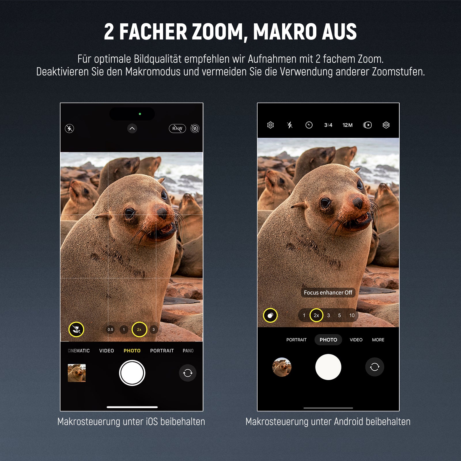 So beseitigen Sie Vignettierungen- Wenn Vignettierung auftritt, zoomen Sie in den Kameraeinstellungen um das 2 fache oder mehr, bis sie aus dem Bild verschwindet. Dieses Objektiv ermöglicht eine bis zu 29 fache Vergrößerung auf 16 Pro. Reinigen Sie die Kamera vor dem Gebrauch gründlich und stellen Sie sicher, dass das Objektiv fest sitzt und keine Lücken vorhanden sind. Für optimale Ergebnisse verwenden Sie bitte ein Stativ