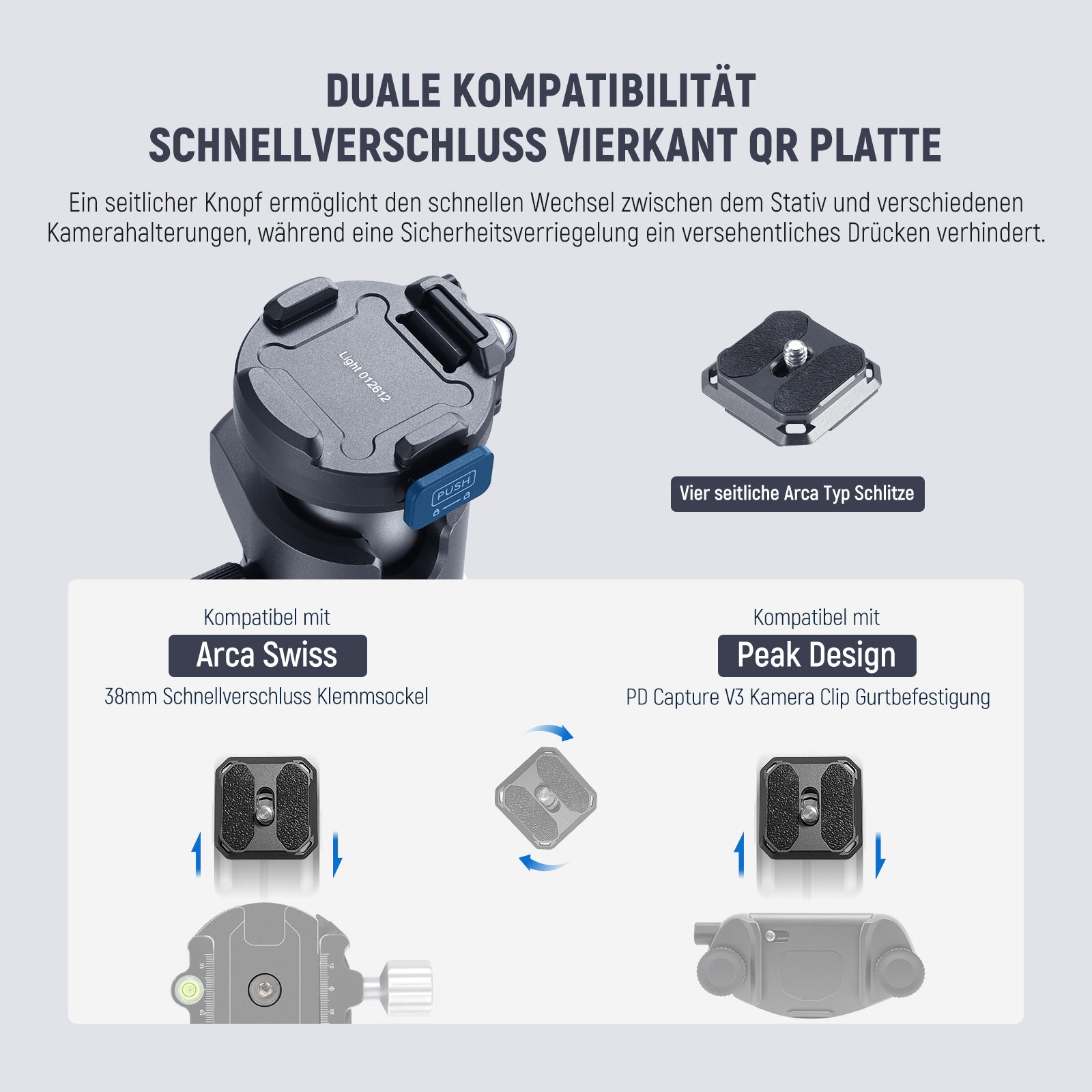 - Schnellwechselplatte vom Typ Arca- Die Schnellwechselplatte vom Typ Arca ist auch mit Peak Design Capture Clip V3 kompatibel. Ein seitlicher Knopf ermöglicht das Anbringen und Abnehmen Ihrer Kamera mit einem einzigen Druck, sodass Sie schnell zwischen dem Stativ und anderen Halterungen wechseln können. Eine Sicherheitsverriegelung verhindert ein versehentliches Betätigen des Auslöseknopfs. Hinweis: Die QR Klemme ist nur mit PD QR Platten und den mitgelieferten Platten vom Typ Arca kompatibel