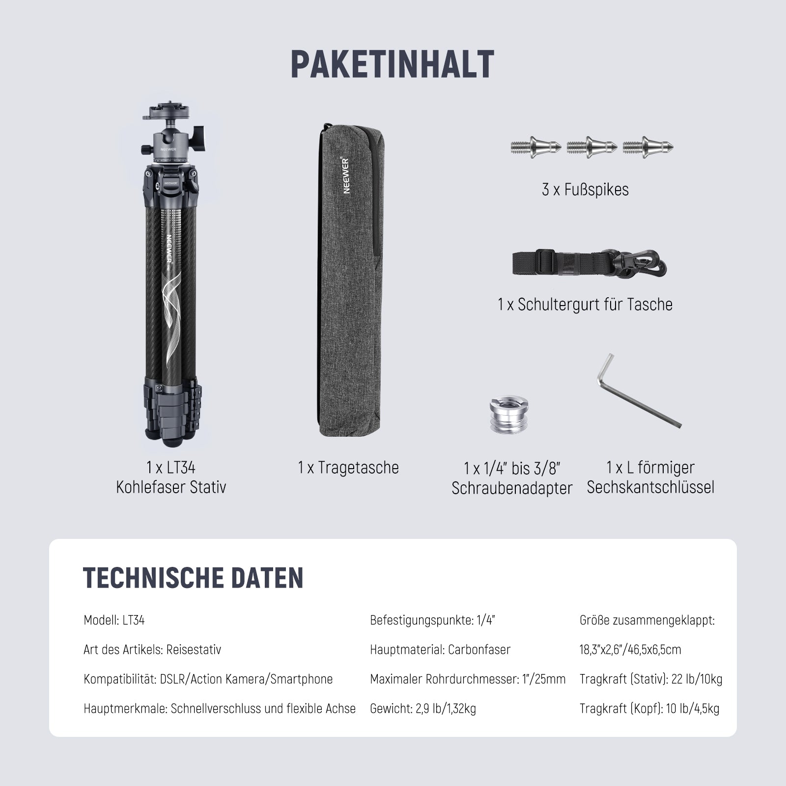 - 100% Carbonfaser Kompakt Travel Tripod- Das LT34 aus der tragbaren Stativserie LTETRIP von NEEWER ist ein 1,18kg leichtes Carbonfaser Videostativ für Smartphones und Cameras mit einem 25mm Rohr für Stabilität und einer Tragkraft von 10kg (4,5kg mit Kugelkopf). Zusammengeklappt misst es nur 43 x 6,5cm und passt problemlos in die Tragetasche. Es verfügt außerdem über einen Haken für Gegengewichte an der Mittelachse, ideal für Außenaufnahmen wie Landschafts, Natur, Tier und Architekturfotografie