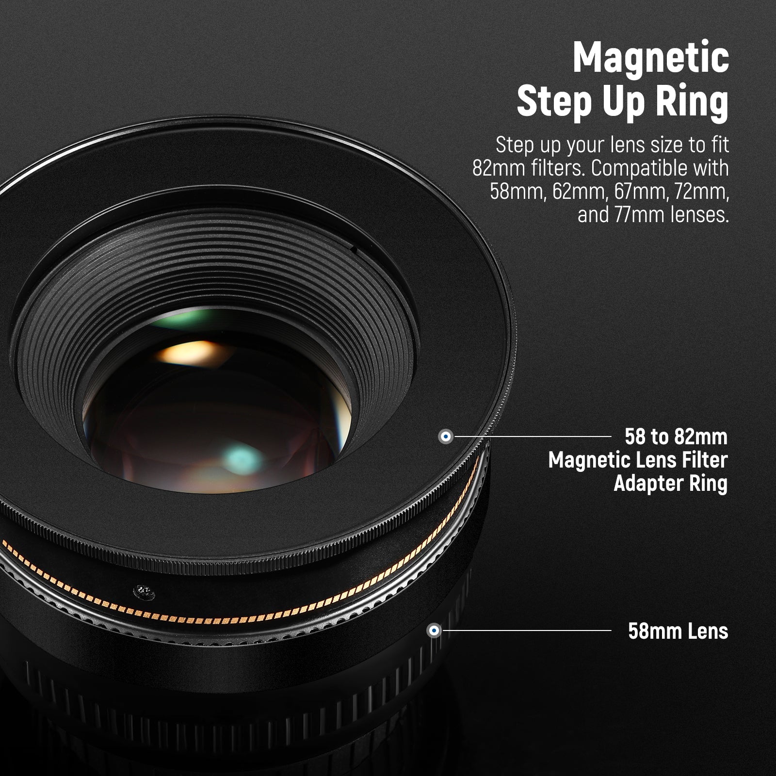 - 【Magnetischer Step Up Ring】 Verwandeln Sie ein 58mm/62mm/67mm/72mm/77mm Objektiv in ein 82mm Objektiv. Die 58 bis 82mm, 62 bis 82mm, 67 bis 82mm, 72 bis 82mm und 77 bis 82mm Aufsteckringe ermöglichen es Ihnen, einen Magnetfilter mit größerem Gewinde (82mm) an einer Kamera mit kleinerem Gewinde (58, 62, 67, 72 oder 77mm) zu verwenden