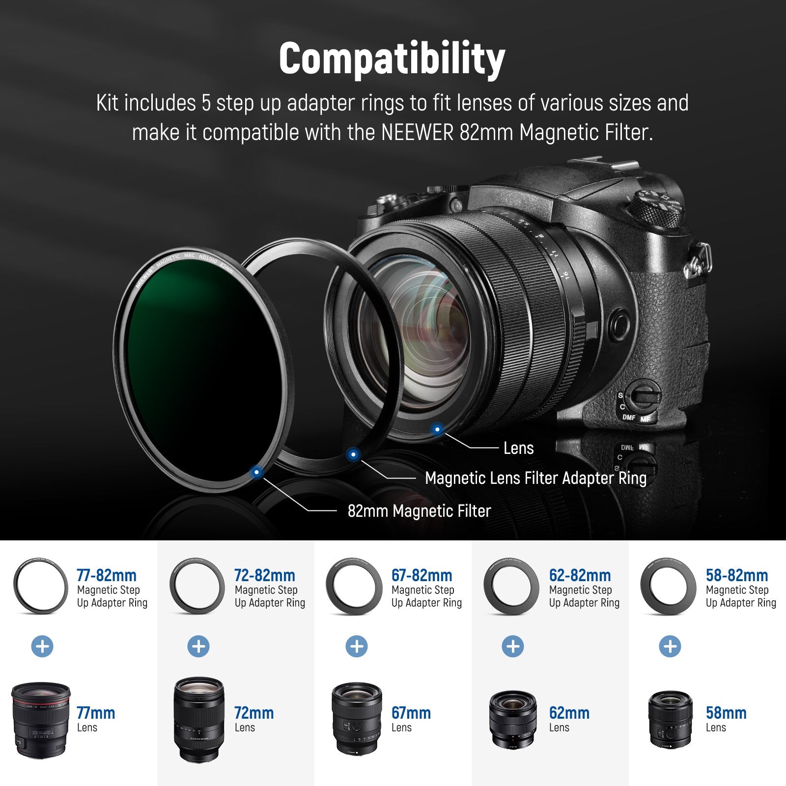 - 【Kompatibilität】 Holen Sie sich dieses Adapterring Kit, damit Sie Ihr 77mm, 72mm, 67mm, 62mm und 58mm Kameraobjektiv mit Ihrem 82mm Magnetfilter verwenden können