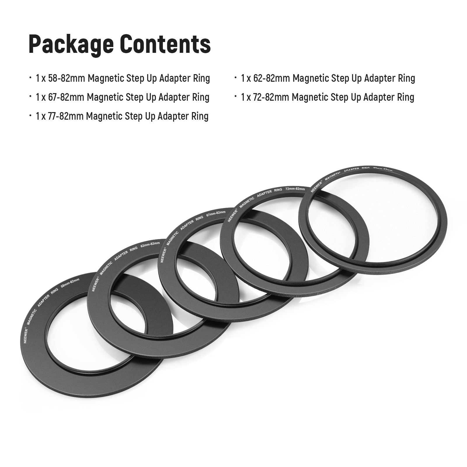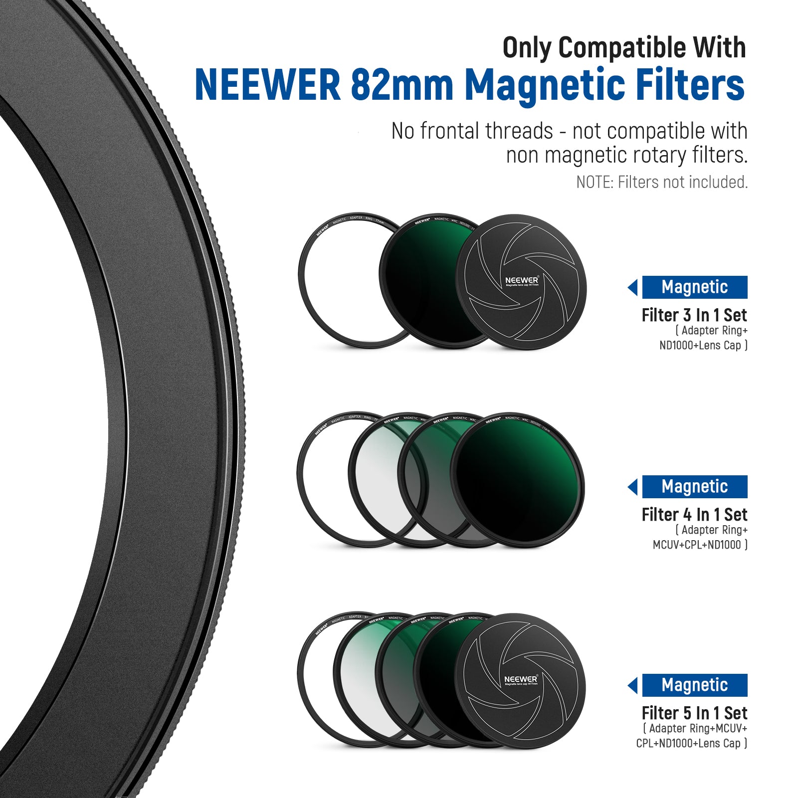 - 【Magnetischer Adapterring】 Dieser magnetische Adapterring ist so konzipiert, dass die NEEWER 82mm Magnetfilter auf Kameraobjektive mit unterschiedlichen Gewindegrößen passen. Montieren Sie einfach den 82mm NEEWER Filter auf Ihr Objektiv mit magnetischer Befestigung