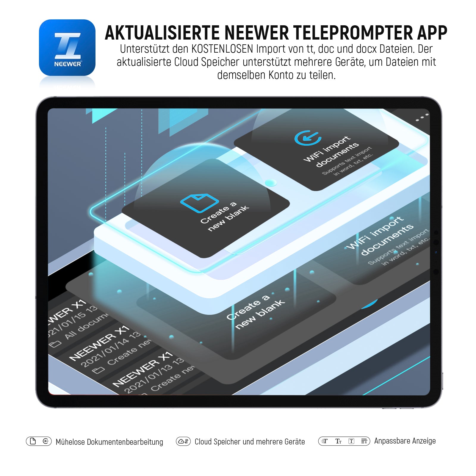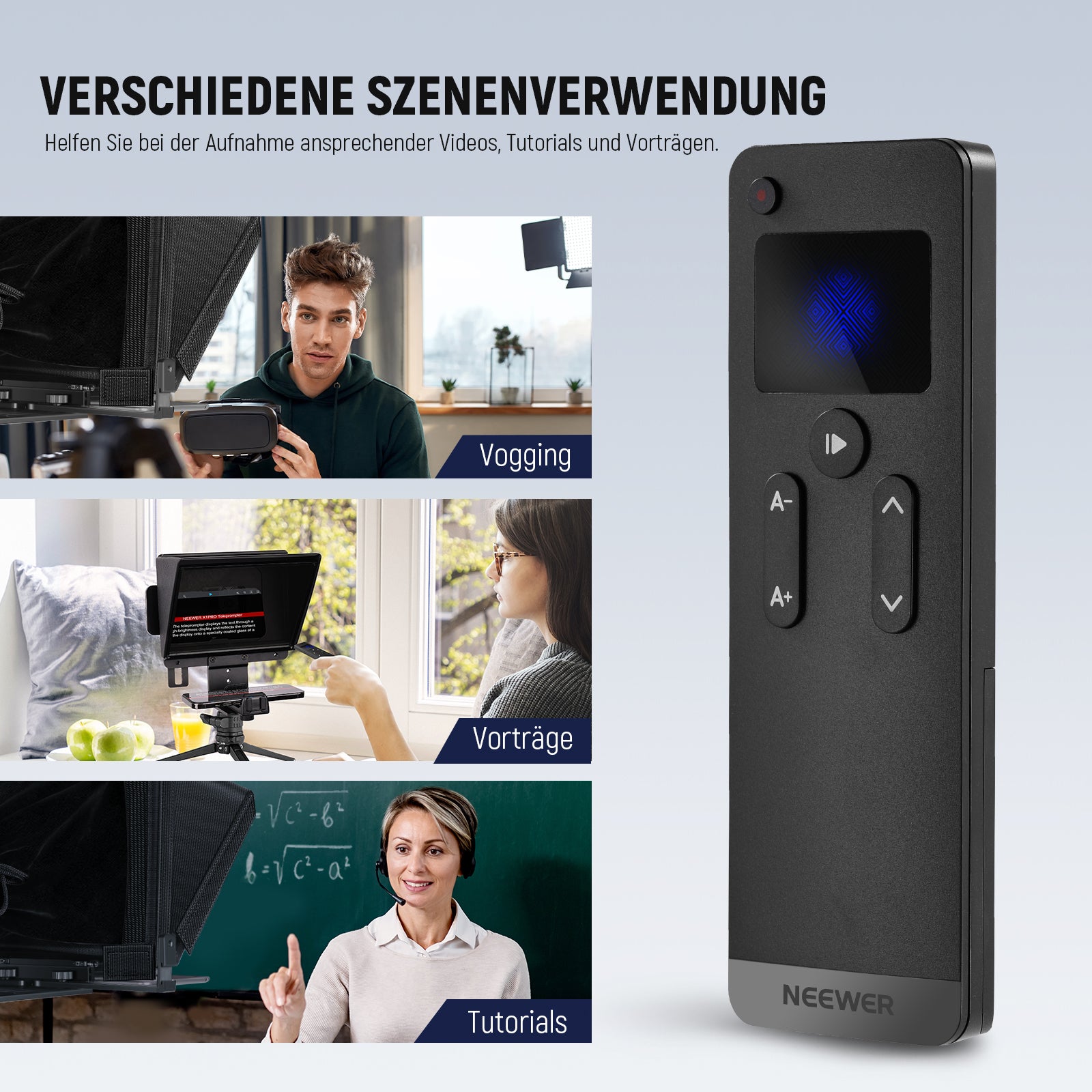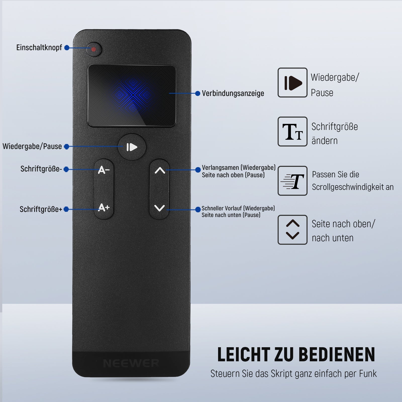 - 【Mühelose Bedienung】 Verwenden Sie die Fernbedienung, um das Skript abzuspielen/anzuhalten, die Schriftgröße zu ändern, die Bildlaufgeschwindigkeit zu steuern und die Seite in der NEEWER Teleprompter App nach oben und unten zu blättern. Die App ist kostenlos im App Store und Google Play Store erhältlich