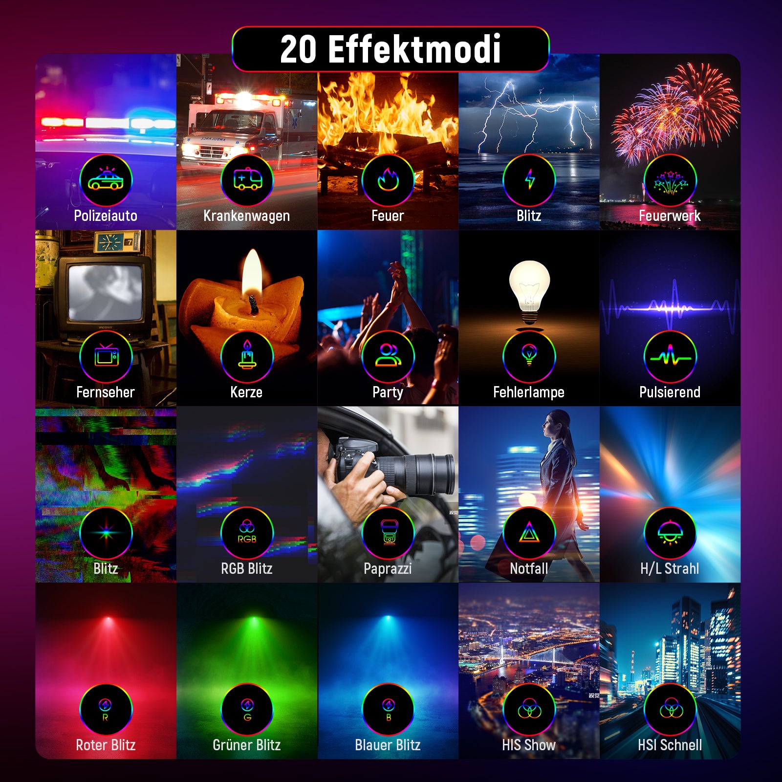 - 【20 Szenenmodi】 Es gibt 20 Szenenmodi für unterschiedliche Fotoanforderungen, darunter Polizeiauto, Krankenwagen, Feuerwehrauto, Blitz, Feuerwerk, Fernseher, Kerze, Party, flackernde Glühbirne, Pulsieren, Stroboskop, RGB Blitz, Paparazzi, Notfall, H/ L Strahl, roter Blitz, grüner Blitz, blauer Blitz, HSI langsam, HSI schnell. Es kann auch als sehr effektives Fülllicht verwendet werden. Für eine optimale Beleuchtung halten Sie es nah an Ihrem Motiv (innerhalb eines Abstands von 2m).