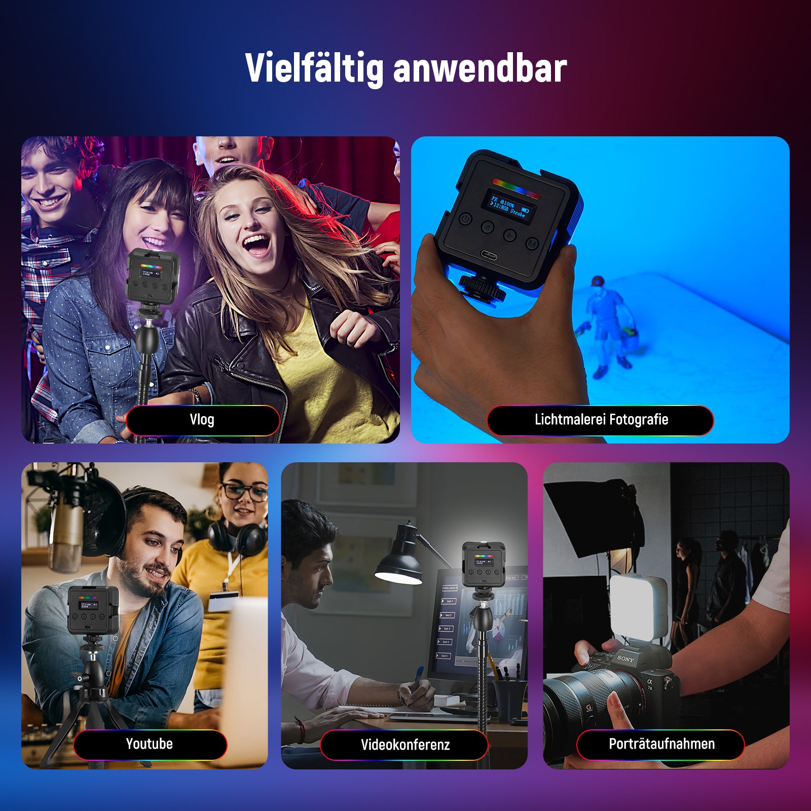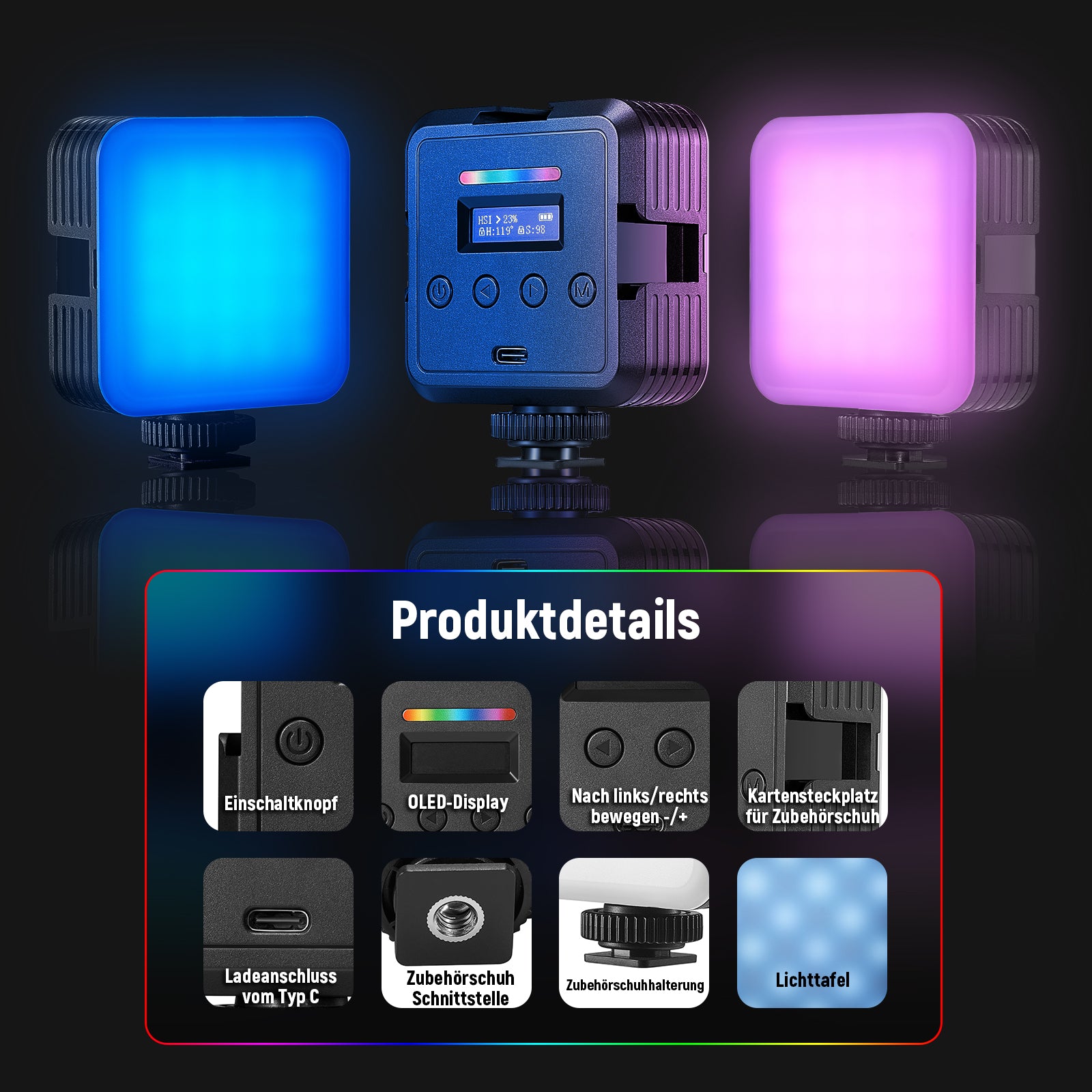 - 【Professionelles RGB LED Videolicht】 Mit 61 LEDs, einem Abstrahlwinkel von 120°, einer maximalen Beleuchtungsstärke von 800Lux bei 0,5m und einem hohen CRI von 97+ trägt dieses 6W RGB61 LED Videolicht dazu bei, eine genauere Farbwiedergabe in Ihren Bildern zu erzielen. Zu den einstellbaren Einstellungen gehören: 0–360° Farbton, 0–100% Helligkeit und ein Farbtemperaturbereich von 2500K (warmweiß) bis 8500K (kaltweiß). Der LCD Bildschirm auf der Rückseite zeigt die Lichteinstellungen deutlich an.