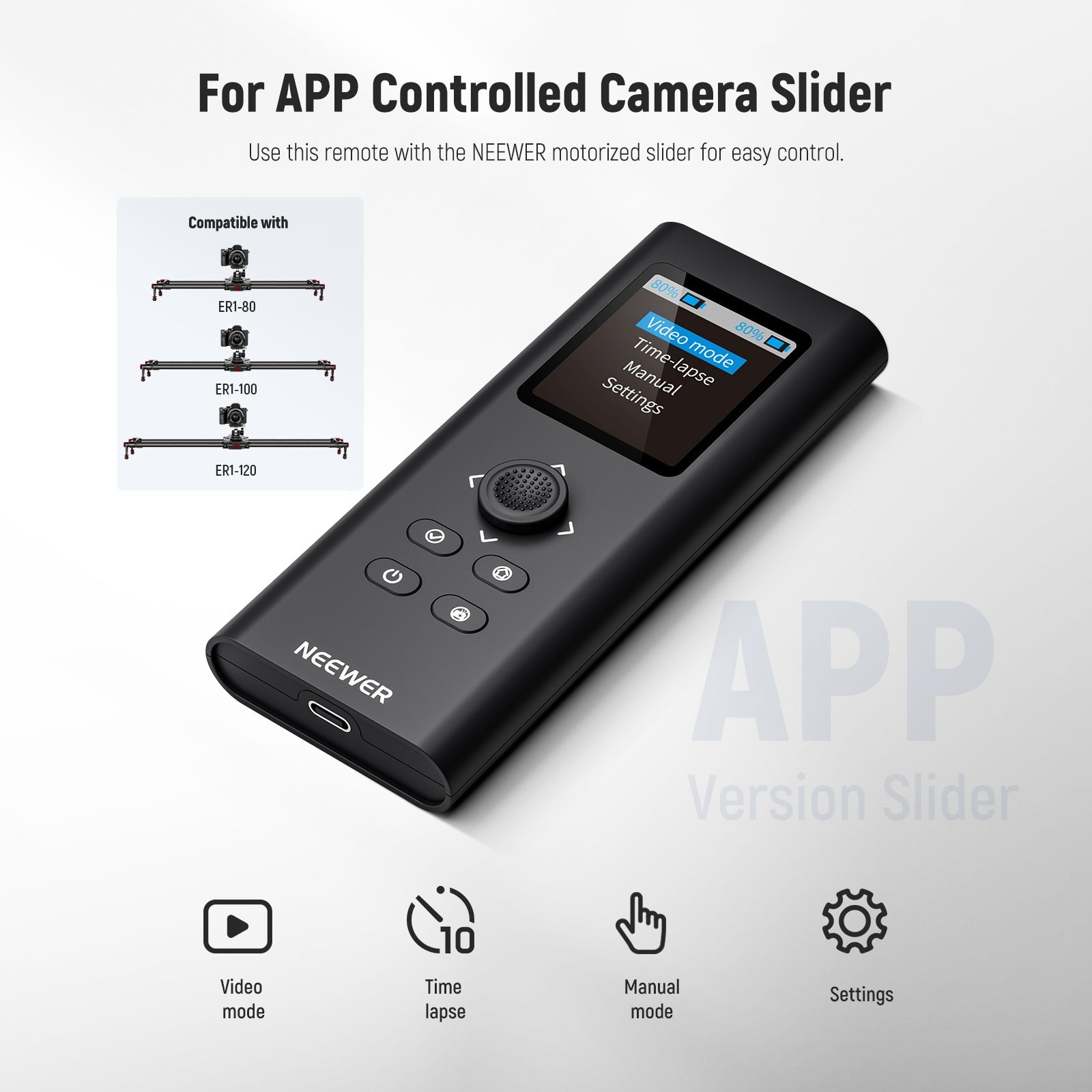 - 【Verbesserte Funk Steuerung】 Die Slider-Fernbedienung wurde aktualisiert, um sowohl mit der älteren Generation als auch mit der neuesten Generation des motorisierten Kamera Sliders von NEEWER kompatibel zu sein, einschließlich des motorisierten Kamera Sliders VS 80WC/VS 100WC 2.4G und der App der ER1 Serie gesteuerter Motorisierten Slider (ER1-120, ER1-100 und ER1-80). Bestellen Sie Ihn, um ihn mit Ihrem NEEWER-Slider zu koppeln, um eine einfache Steuerung zu erreichen