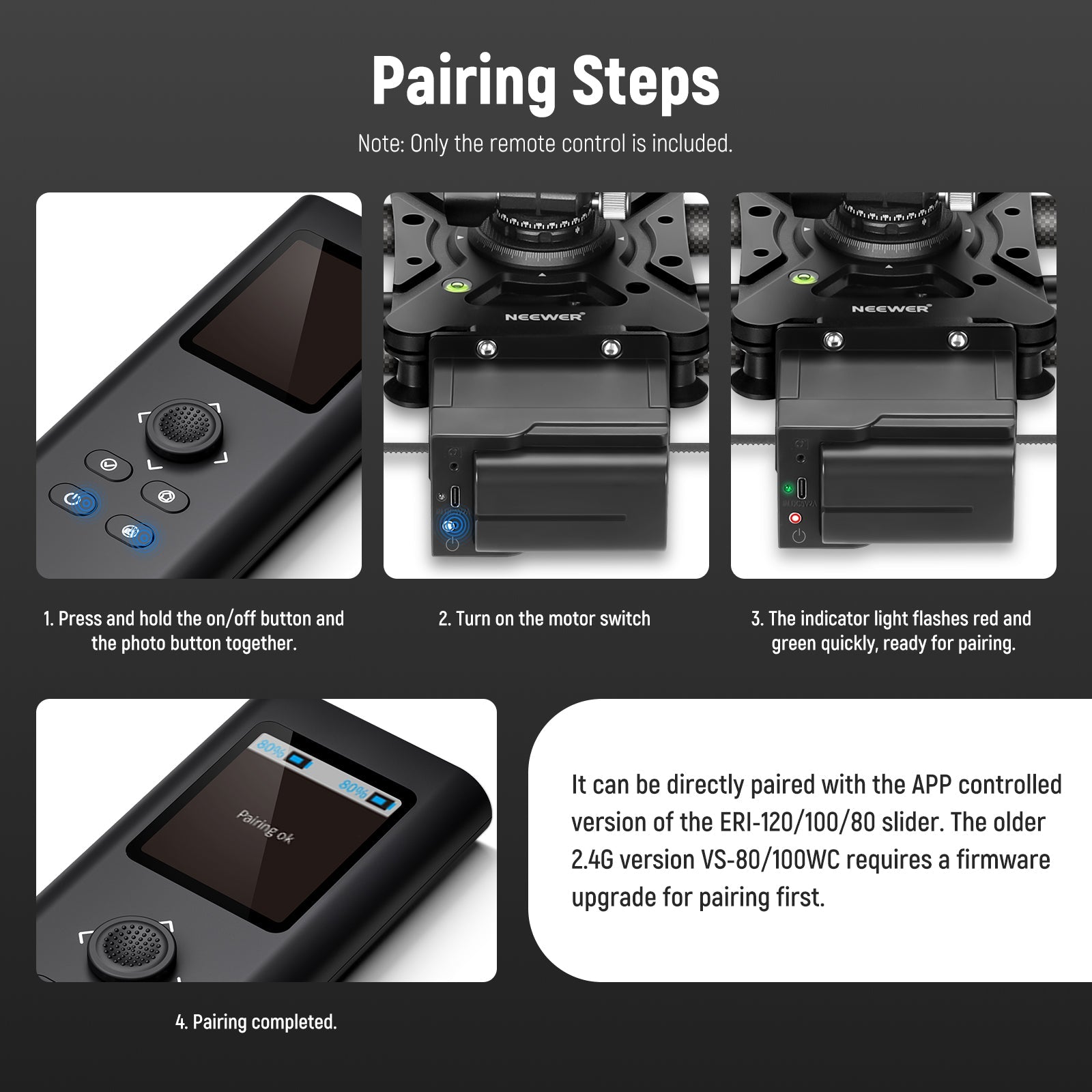 - 【Paarungs Schritte】Ohne ein Firmware Upgrade erforderlich zu sein, können die App gesteuerte Slider Linie (ER1-120, ER1-100 und ER1-80) und die neueste Generation von 2,4G gesteuerten Slidern VS 80WC/VS 100WC mit der Fernbedienung gekoppelt werden, indem Sie die folgenden Schritte ausführen: 1. Drücken Sie lange die Ein /Aus Taste und die Kamerataste; 2. Schalten Sie den Motorschalter ein; 3. Die Kontrollleuchte blinkt schnell rot und grün; 4. Die Kopplung ist abgeschlossen