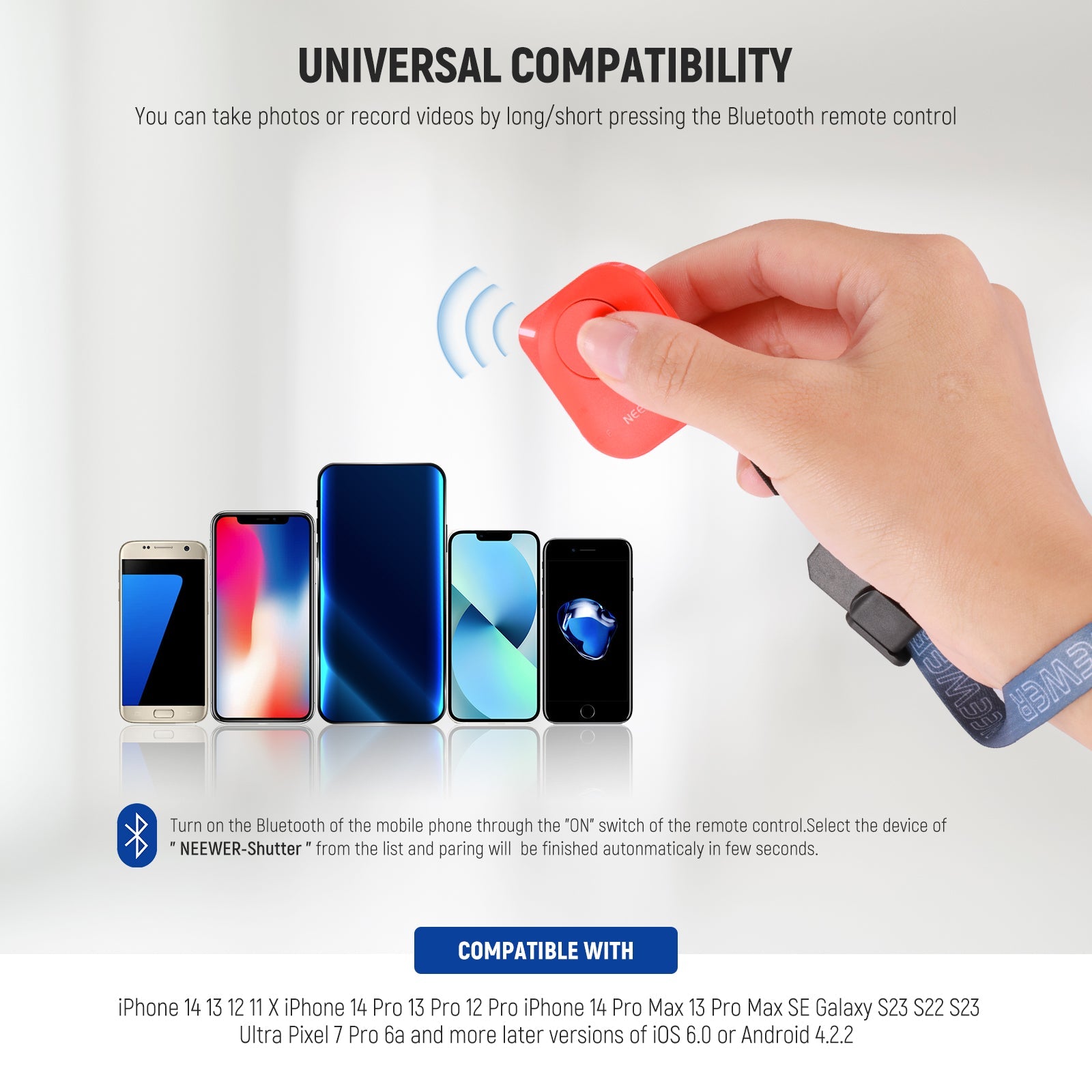 - 【Nehmen Sie Selfies mit 1 Druck auf】 Koppeln Sie diesen Fernauslöser mit Ihrem iOS/Android Mobiltelefon oder -Tablet über eine Bluetooth Verbindung für Selfies, Porträts, YouTube Videos und Zoom Anrufe – alles mit 1 Druck in Ihrer Handfläche. Kurz drücken für Fotos, lange drücken für Videos