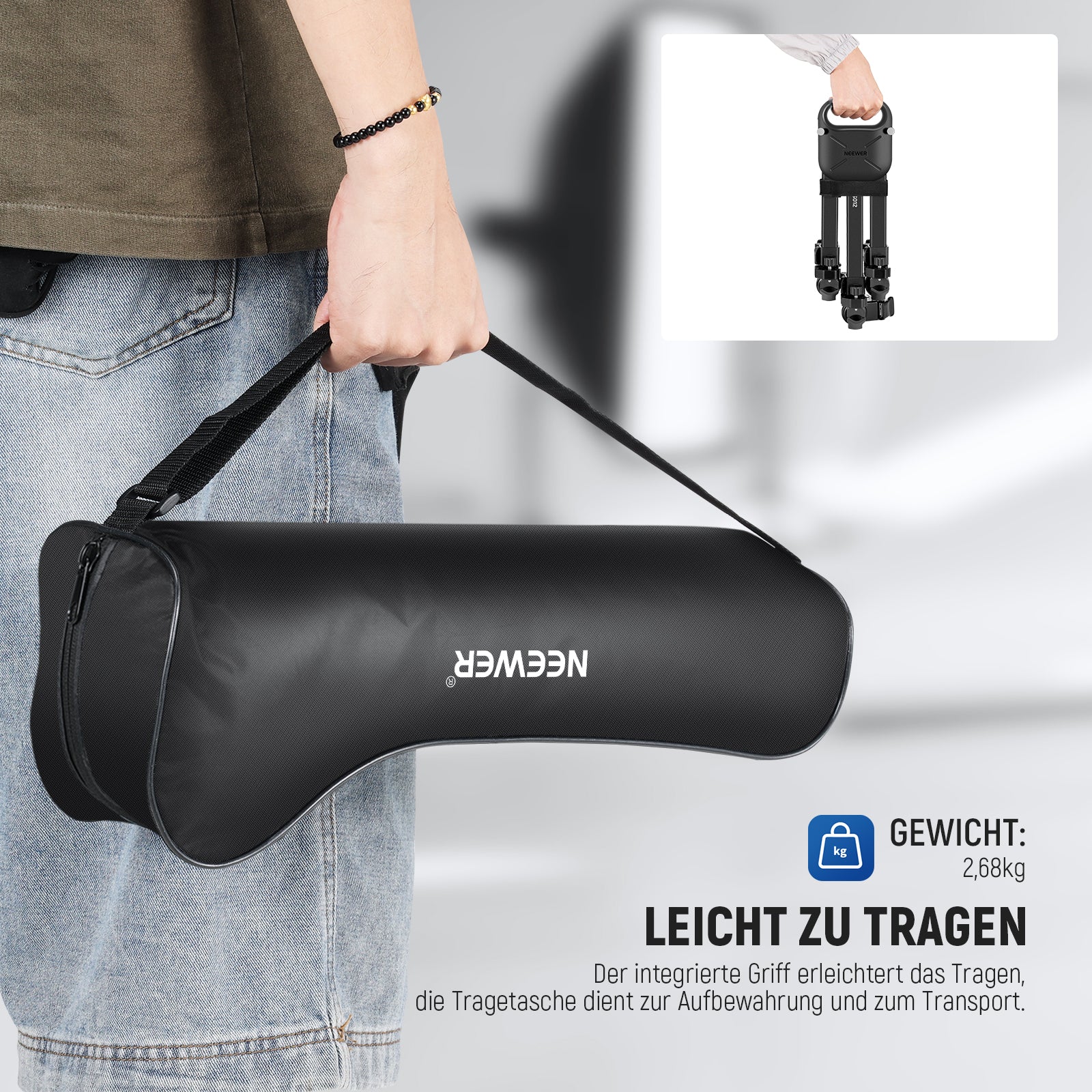 Integrierter Griff und tragbares Design- Mit den Verriegelungsknöpfen der Dolly Beine lassen sich die klappbaren Beine und der Griff auf ihre Mindestgröße einstellen und lassen sich zur Aufbewahrung und zum Transport einfach in der Tragetasche verstauen. Ideal für die Fotografie unterwegs als unverzichtbares Zubehör für Content Creator und essenzielle Kameraausrüstung für Influencer