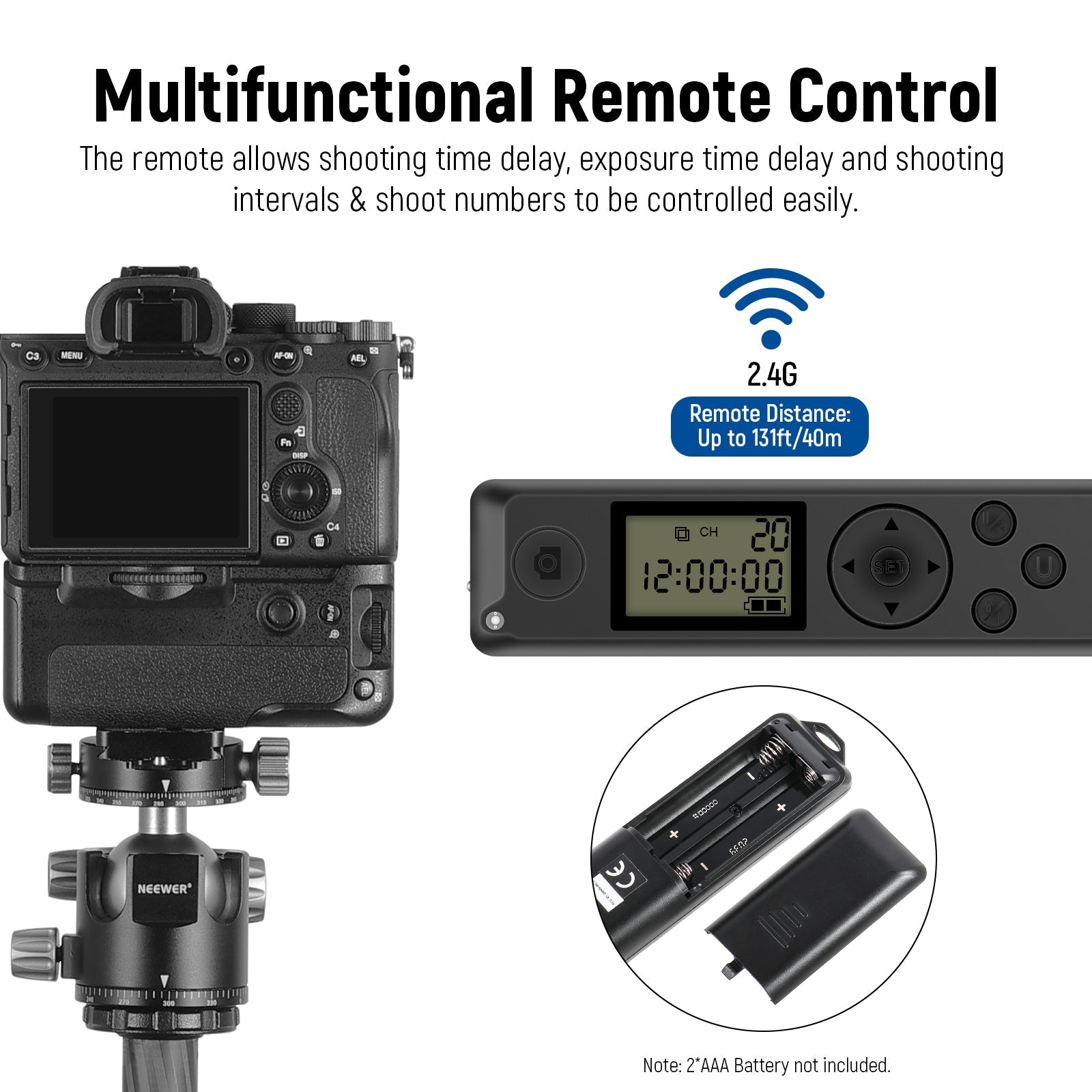 - 【Multifunktionale Fernbedienung】 Die Fernbedienung wird über eine 2,4G Übertragung mit dem Batteriegriff gekoppelt und die Steuerreichweite beträgt bis zu 40m. Die multifunktionale Fernbedienung mit LCD Display unterstützt Fokussierung/Fotografie, Infrarotaufnahmen, und der Fotograf kann Verzögerungszeit, Belichtungszeit, Intervalle und Aufnahmeanzahl frei einstellen. Darüber hinaus wird die LCD-Bildschirmsperre unterstützt