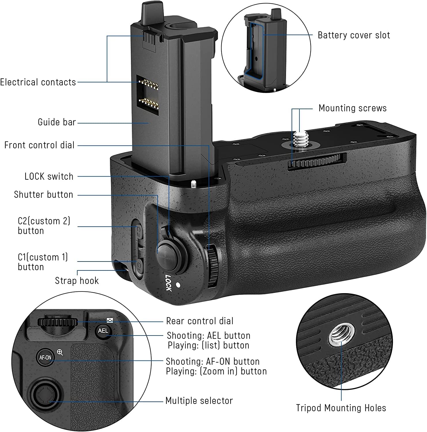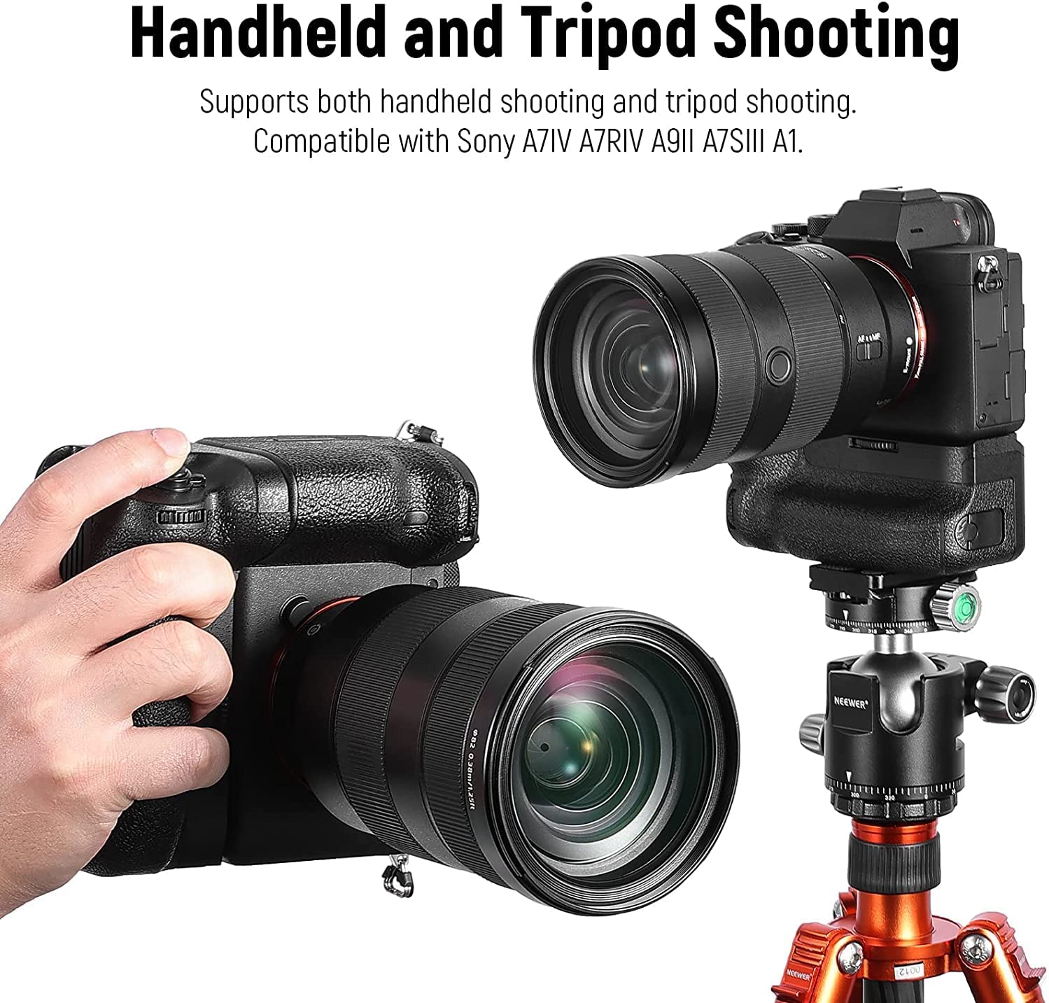 - 【Batteriegriff Kompatibel mit Sony】Ergonomisch gestaltet, bietet dieser Batteriegriff einen bequemen Handgriff, um Ihre Kamera zu halten. Durch die Speicherung von einem oder zwei NP-FZ100 Batterien ist der Griff mit Sony A9II A7IV A7RIV A7SIII A1 Cameras BG A7IV kompatibel, um die Lebensdauer der Kamera Batterie für längere Aufnahmezeit zu verlängern. Über das untere 1/4"Gewinde kann er auch auf einem Stativ befestigt werden